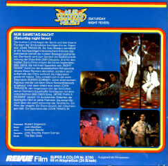 Von marketing-film hergerstellte Kurzfassung für REVUE-Film auf Polyester. Kein Logo, sondern eine Titeltafel und die typisch verhassten weiß/blauen Titel starten den Film, während schon die fetzige Musik von den Bee Gees zu hören ist. Zuerst das schönste: die Farben sind Traumhaft, absolut Traumhaft, knallig bunt. Dazu eine gute Bildschärfe und ein lauter, basshaltiger Ton, macht diese Kurzfassung quasi zu einem Juwel, wenn nicht gerade mal statt der angegeben 66 Meter nur 49 Meter vorhanden sind (laut Foto-Quelle Katalog 1981). Der Hammer ist ja noch, das dieser kurze Filmteil damals stolze 95,90 DM kostete. Und was zeigt sich in dieser Kurzfassung ? Tony Manero (John Travolta) zieht sich an, ist in der Disco, quatscht kurz mit seiner Tanzpartnerin (Donna Pesco), tanzt kurz mit dieser, sie überredet ihn bei der Tanzveranstaltung mit zu machen, doch Tony sieht Stephanie (Karen Gorney), quatscht diese an und tanzt schließlich das Turnier ("How Deep Is Your Love") - Ende! Es wirkt quasi wie ein langer Trailer. Da hier ausschließlich Szenen enthalten sind die aus dem marketing-film Dreiteiler stammen, läßt sich hier auch nichts verwenden.