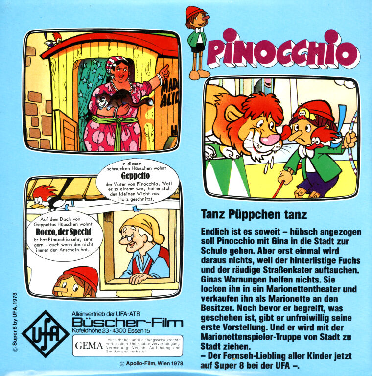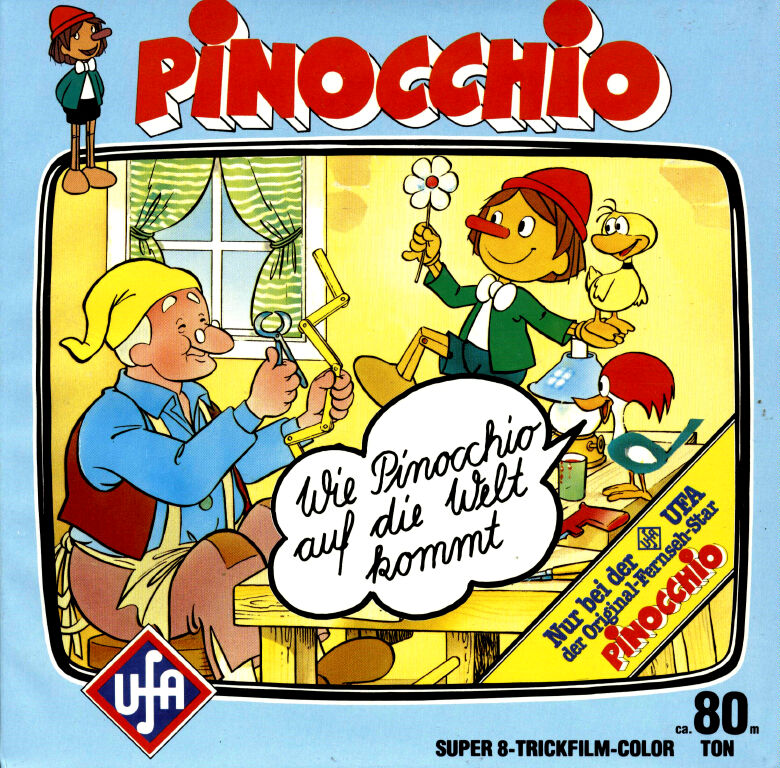 Fernsehserien auf Super 8 wurden damals von allen drei großen Firmen angeboten, jedoch war UFA die einzige, die diese Serien in Hülle und Fülle herausbrachte. Der Reiz diese auf Super 8 herauszubringen lag in der Größe des Bildes - statt eines kleinen Fernsehschirms auf der großen Leinwand zu Hause. Nicht nur das, von der hier rezensierten Kopie gab es zusätzlich noch eine 33m color / ton Fassung. Das berühmte Titellied von "Mary Roos" ist natürlich im Vorspann in voller Länge dabei. "Wie Pinocchio auf die Welt kommt" ist die erste Episode der Serie und wird hier gut gekürzt wiedergegeben. Die Bildschärfe ist befriedigend. Der Ton ist laut aufgespielt und die Farben sind - wie im Fernsehen - sehr gut.