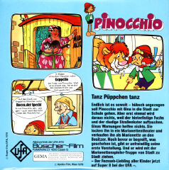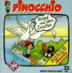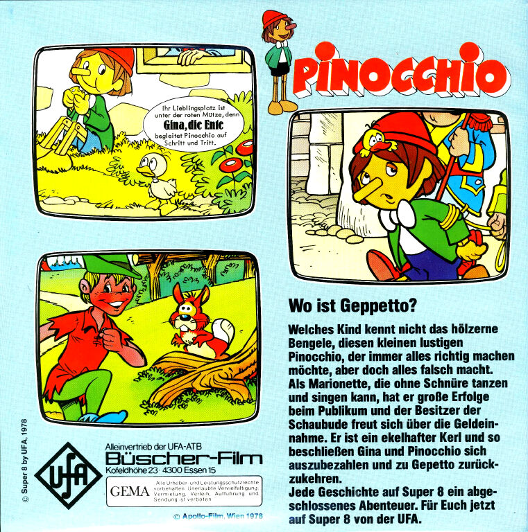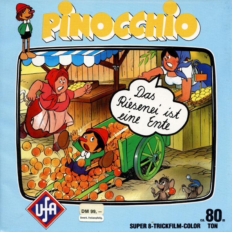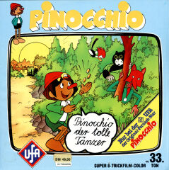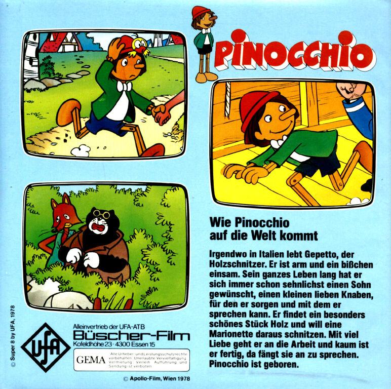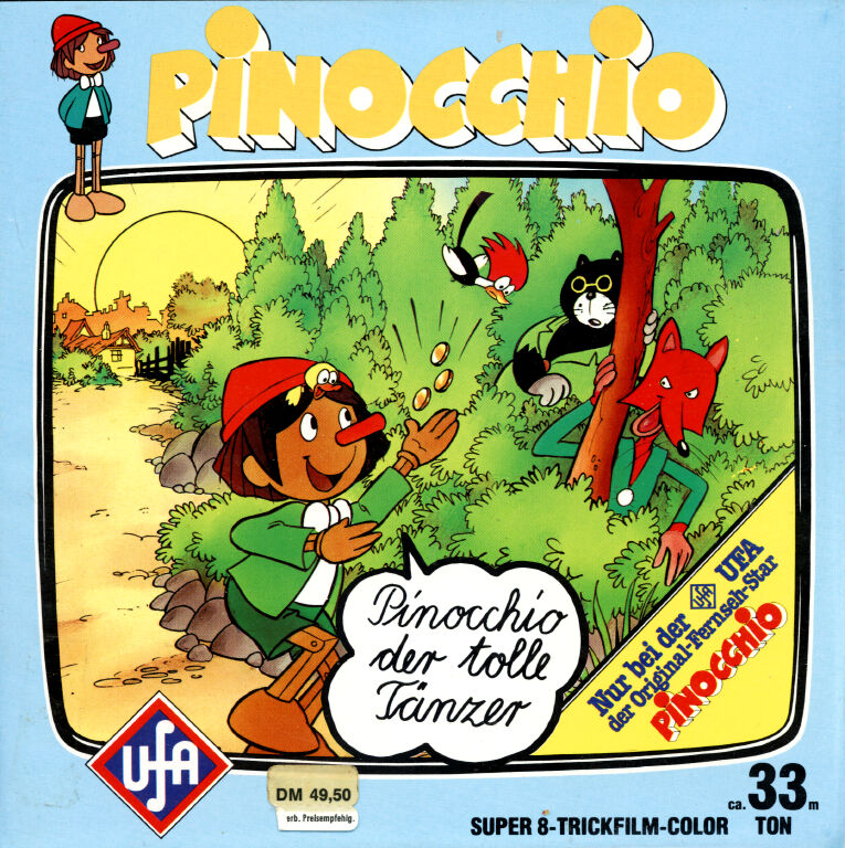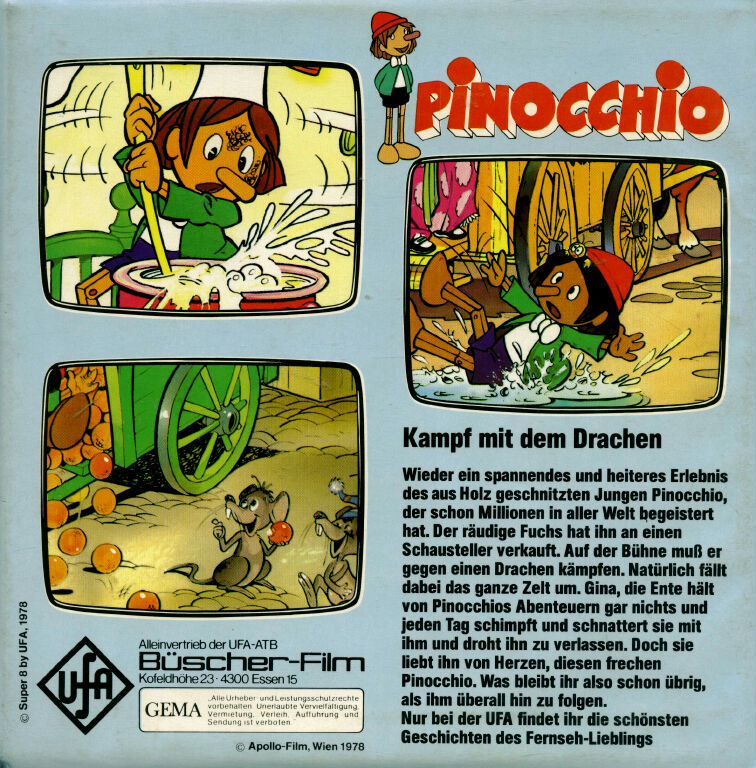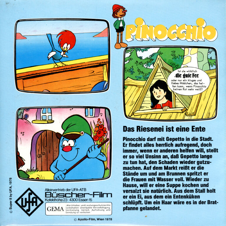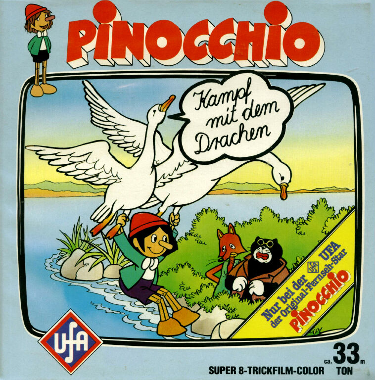 Von "Pinocchio" gab es verschiedene Ausführungen mit z.T. anderen Titeln. Warum hatte UFA nicht gleich alles einheitlich gestaltet und somit für Sammler einen besseren Überblick geschaffen ? Da wurde aus der 80m Fassung "Wie Pinocchio auf die Welt kommt" nun die beiden 33m Fassungen "Das hölzerne Bengele" und "Viel Qualm in der Bude". Ersichtlich wurde das aber aus den Covertexten nicht, denn die Texte auf den Covern unterscheiden sich stark.