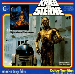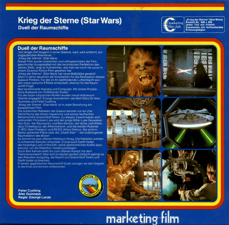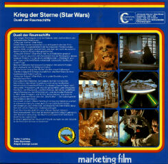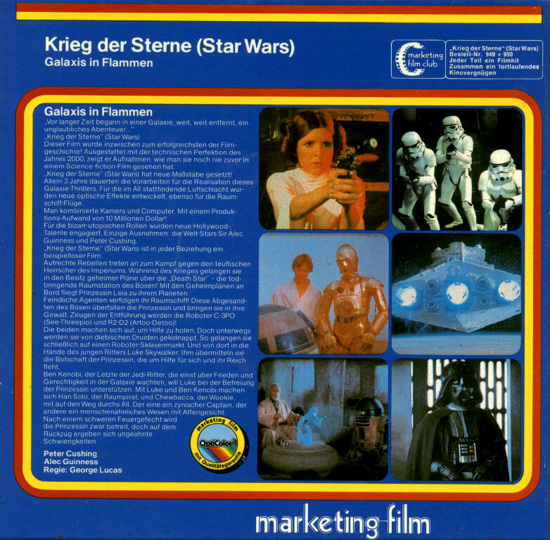 marketing-film, der kleinste Super 8 Anbieter neben piccolo-film und UFA, schaffte mit der Veröffentlichung dieser Schnittfassung etwa 10 Monate nach dem Kinostart den Durchbruch in der Super 8 Szene, den die Qualität der 180m Fassung war sehr ordentlich. Da die Firma wegen der Lizenzrechte keinen Zwei- oder Dreiteiler, sondern nur eine 120m und eine 60m Fassung herausbringen durfte, wurde so mancher Käufer wegen des fehlenden Endes mit dem Todesstern bitter enttäuscht. Aber nichts desto trotz hat man mit vorliegendem Film eine gute Schnittfassung in sehr guter Qualität. Während des marketing-film Logos hören wir bereits erste Takte aus dem Star Wars Soundtrack, gefolgt von der schönen 20th Century Fox Fanfare. Danach hören wir den berühmten "marketing-film" Sprecher, der auch schon bei anderen Fassungen und den Musterfilmen dieser Firma seine Stimme lieh, aus dem Off den Einleitungstext sprechen und schauen gebannt zu, wie Darth Vader mit seinen Sturmtruppen das Konsularschiff stürmt und Prinzessin Leia gefangen nimmt. Umkopiert von Scope auf Vollbild in guter Bildschärfe. Die Farben sind Traumhaft und der sehr laute und satte Ton läßt die Lautsprecher vibrieren. Dies gilt übrigens auch für den zweiten Akt, der 60m Fassung. Es gibt Azetat und Polyester Kopien. Schade ist nur, das im zweiten Akt genau die Szene fehlt, in der Obi Wan von Darth Vader's Laserschwert getroffen wird. Für mich bietet der Film auch heute noch allerbeste Unterhaltung und ist absolut empfehlenswert!