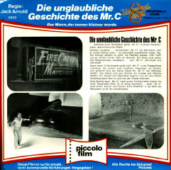 piccolo-film übernahme von Universal 8. Es erwartet ein grob-körniges Bild. Die Bildschärfe kann gerade noch zwischen gut und befriedigend eingestuft werden. Die ersten Meter sind besonders dunkel kopiert. Das Bild ändert sich aber ab der Szene, in der Mr.C im Puppenhaus wohnt. Von dort ab bis zum Ende hin ist das Bild wesentlich besser, auch in der Schärfe. Der Ton ist sehr laut aufgespielt. Der piccolo-film Tonmeister hat ein besonderen Pluspunkt verdient: er hat nicht nur sehr gut die deutschen Sätze übernommen, sondern sogar in sich noch gekürzt, was wirklich eine Meisterleistung ist. Dies fällt auf bei den Szenen beim Arzt und zum Schluß, wenn man nur den Gedanken von Mr.C lauscht. Wer das Original kennt, der weiß, wie schwierig das gewesen sein muß. Im übrigen zeigt der Film nach dem Universal Eight Logo nicht die Original Betitelung, sondern es wurden bereits während der Handlung eigene Titel eingeblendet. Die Super 8 Kopie ist sehr gesucht, aber wenn man sie hat, gibt man diese nie wieder her! Absolut empfehlenswert!