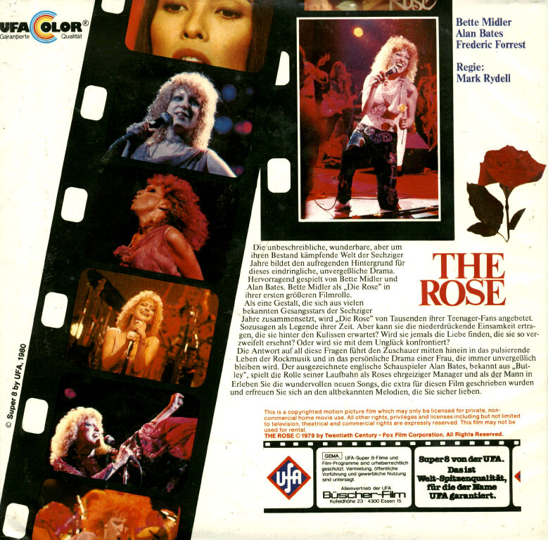 UFA übernahme von Ken-Films. Bevor man sich diese Schnittfassung anschaut, sollte man den Film in voller Länge sehen. Man kann nur erraten, um was es hier geht. Zu sehen und zu hören sind 4 Songs, die "The Rose" Bette Midler zum besten gibt und das war es. Die zwei kurzen Dialoge die zwischen den Nummern zu sehen sind, bringen den Betrachter auch nicht weiter. Der Film beginnt mit dem 20th Century Fox Logo, gefolgt von der Originalbetitelung (stark gekürzt). Am Ende ein nur sehr sehr kurzer Abspann. Der Film hat kleine Balken, wechselt aber ab und zu in ein Vollbild um. Die Farben sind ganz große Klasse! Der Ton ist Ordentlich, jedoch die Bildschärfe nicht so. Warum die UFA seinerzeit diese Fassung herausbrachte, ist ein Rätsel.