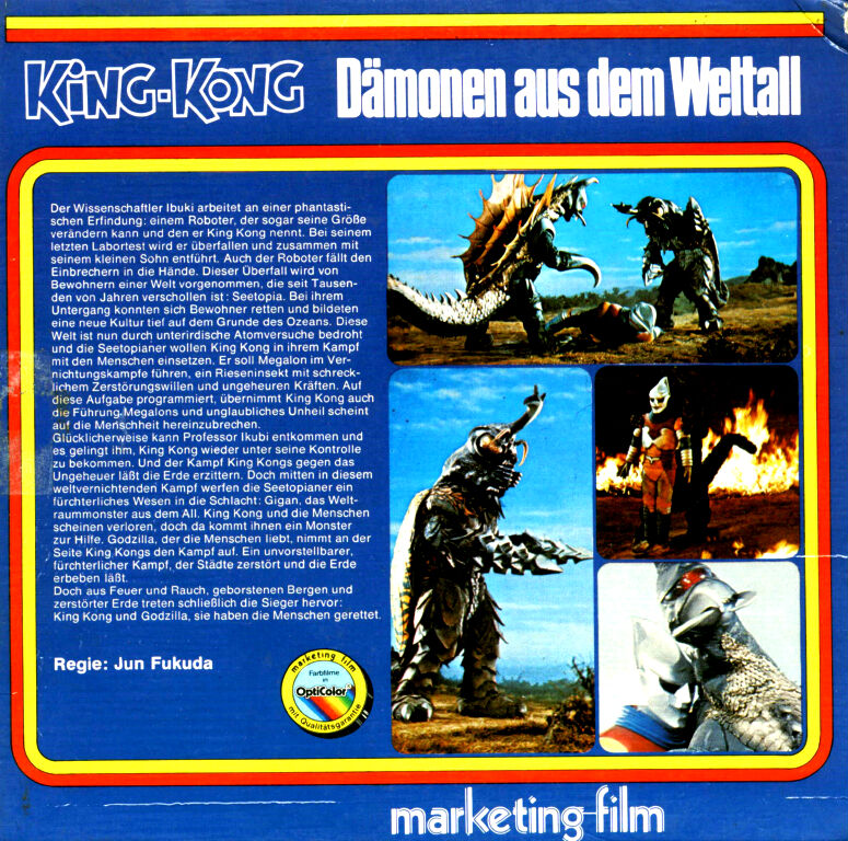 Knapp ein Jahr nach dem deutschen Kinostart veröffentlicht marketing-film 1975 diese schöne Schnittfassung. Der Film wird durch gute kurze Schnitte verständlich präsentiert, so das man das Original nicht unbedingt kennen muß. Nach dem alten marketing-film Logo folgt in Balkenbild die Vorhandlung, ehe der Titel in Vollbild zu sehen ist. Danach gehts bis zum Ende im Balkenbild weiter. Die Bildschärfe, sowie die Farben sind gut. Der Ton ist sehr laut aufgespielt. Die Kopiervorlage hat jedoch einige Gebrauchsspuren in Form von Kratzern und verregnen. Schöne Schnittfassung, aber wie so oft kein Ende Titel. Es gab von marketing-film zwei verschiedene Cover, denn die Zweitauflage sollte eine Verwechslung mit einem Teil des Vierteilers "KING KONG (1976)" von Dino de Laurentiis verhindern und somit fehlt auf dem Cover der Aufdruck "KING-KONG".