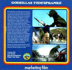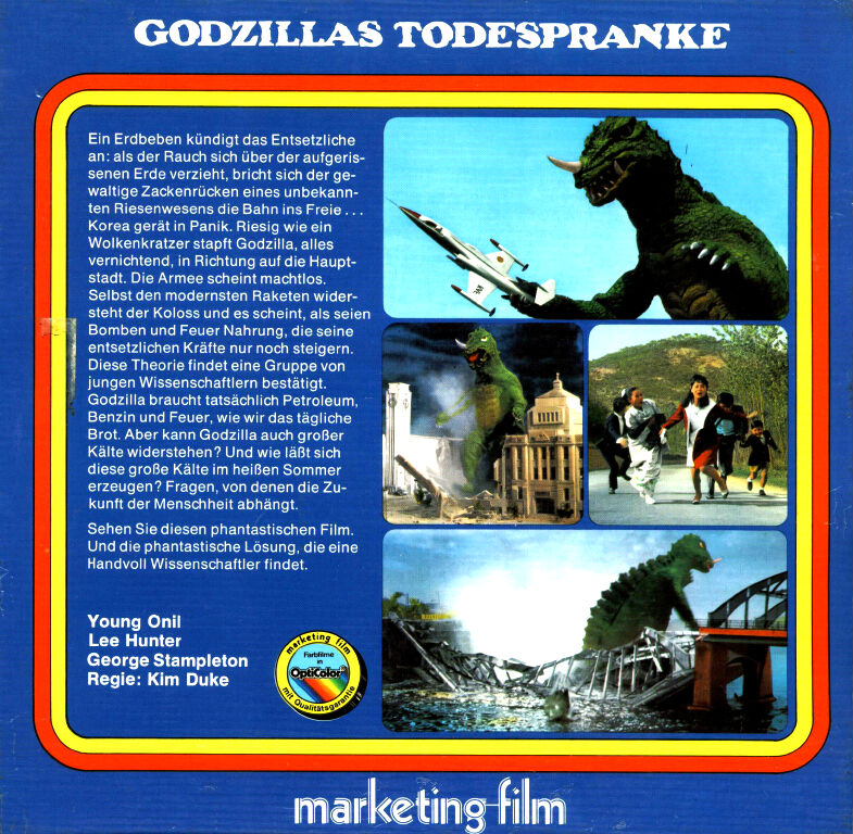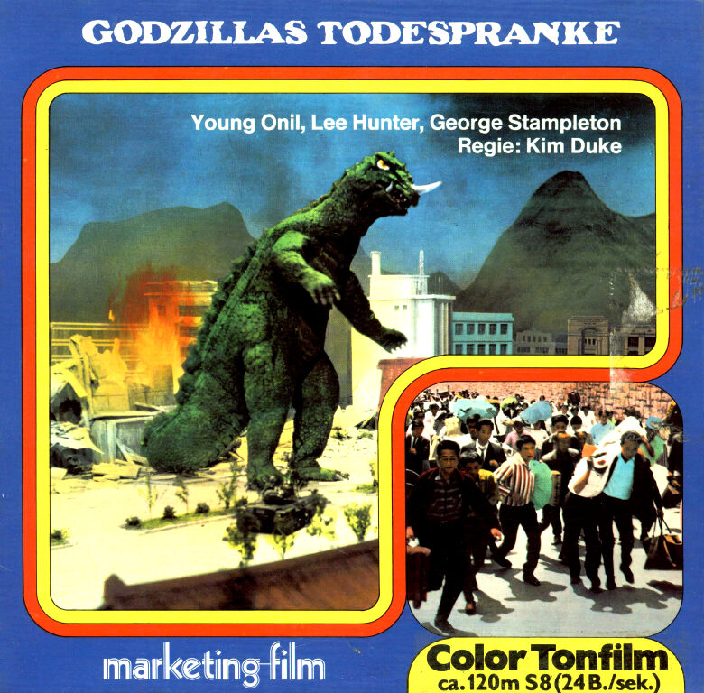 Drei Jahre nach dem deutschen Kinostart veröffentlicht marketing-film diese 120m Schnittfassung, die damals in Color, aber auch in Schwarz-Weiss zu haben war. Leider hat hier marketing-film keine so gute Arbeit, wie bei anderen 120m Schnittfassungen, geleistet. Nach dem "alten" marketing-film Logo (Spielfilme für Anspruchsvolle) werden kurz Darsteller und Filmtitel vom Originalfilm gezeigt (und zur Verwunderung heißen die Darsteller anders, als auf der Packung angegeben!) und sind bereits in Mitten der Handlung. Kopiert wurde mit Balken, der Ton ist klar und laut aufgespielt und das Bild hat eine gute Schärfe. Allerdings muß nach etwa der Hälfte des Films nachgestellt werden, da plötzlich in der Bildmitte alles unscharf wird. Jetzt zu den Fehlern dieser Kopie: Während des ganzen Films ist ein leichtes Flackern (hell / dunkel) in der Bildmitte zu erkennen. Gegen Ende (die Szenen mit dem Hubschrauber) springt das Bild auch 2x nach oben und wieder zurück. Dieser Fehler ist einkopiert! Wieder mal typisch: kein Ende Zeichen. Was ich allerdings nicht Bewerten kann sind die Farben, da die vorliegende Kopie bereits vom Rotstich befallen ist. Da es sich hierbei auch nicht um einen Original Godzilla Film handelt, gehört er auch nicht in jede Sammlung. Für mich völlig Verständnislos: der Covertext auf der Packung, in dem immer wieder von "Godzilla" die Rede ist, obwohl im Film selbst das Monster nur "YONGARY" genannt wird. Der Trailer ist ebenfalls auf Super 8 in CinemaScope erhältlich!