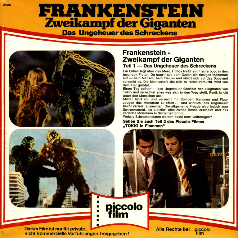 Vor der japanischen Küste wird ein Fischerboot von einem grünen, menschenähnlichen Ungeheuer attackiert. Der einzige Überlebende berichtet, dass sein Boot von Frankenstein angegriffen wurde. Dieser galt seit zwei Jahren als tot. Dr. Kitei, der ihn einst aufgezogen hatte, berichtet, dass Frankenstein seinerzeit aus dem Labor ausgebrochen und in den Bergen gestorben sei. Ferner betonen Dr. Kitei und seine Assistentin Akemi, dass ihr Geschöpf immer friedlich gewesen sei und nicht im Wasser leben könne. Nachdem das Geschöpf an der Küste auftaucht und zwei Fischer in Panik versetzt, finden sich an deren Boot Reste von Monsterhaut. Als das grüne Monster an einem Flughafen auftaucht, stellt sich heraus, dass es empfindlich auf Licht reagiert. Einen weiteren Angriff des Monsters kann das Militär mit Lasergeschützen abwehren; doch taucht plötzlich ein braunes Monster auf, das dem verletzten Grünen hilft. Es stellt sich heraus, dass der Braune Frankenstein ist und in den Bergen lebt. Nach dem Fund von Hautresten des Grünen in einem Bergsee vermutet Dr. Kitei, dass der Braune sich nach seiner Flucht aus dem Labor in dem See verletzt und Zellgewebe zurückgelassen hat, aus dem sich der Grüne entwickelte. Dr. Kitei warnt das Militär davor, die Ungeheuer zu beschießen, da aus den Hautresten der Wunden viele neue Ungeheuer entstehen könnten. Kurz hintereinander tauchen der Grüne und der Braune in Tokio auf. Dr. Kitei und Akemi machen sich auf, dem Braunen zu helfen. Während der Suche wird Akemi vom Grünen verletzt. Wenig später taucht der Braune auf und will den Grünen von seiner Zerstörungswut aufhalten. Während ihres Kampfes hinterlassen die beiden in der Innenstadt von Tokio eine Schneise der Zerstörung. Obwohl Dr. Kitei dafür plädiert, abzuwarten, bis der gutmütige Braune den Grünen unschädlich macht, setzt das Militär Panzer sowie, gegen den Grünen, Laserstrahlen ein. Als beide Monster, sich weiterhin bekämpfend, ins Wasser flüchten, bricht ein Vulkan aus. Dr. Kitei und Akemi erfahren bestürzt, dass der Vulkan beide unter sich begraben hat. (Text: Wikipedia)