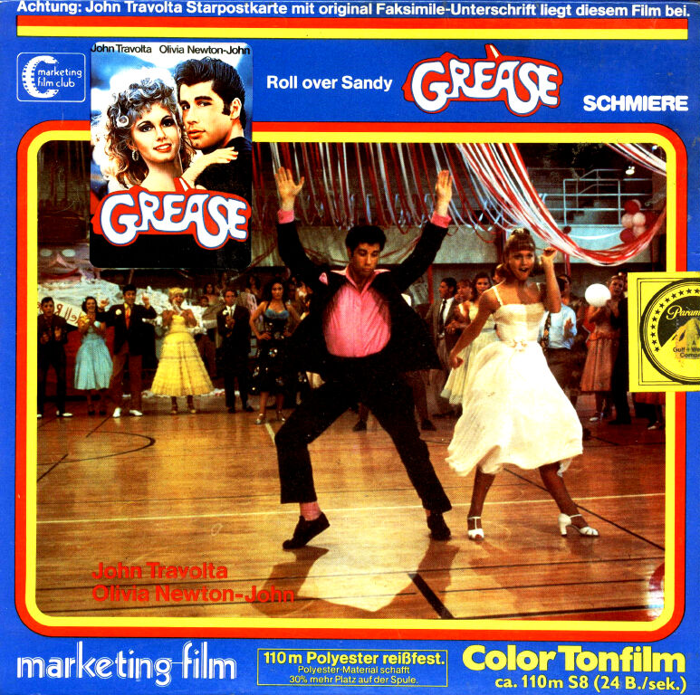 marketing-film hatte mit der Veröffentlichung dieses Dreiteilers vielen Super 8 Filmfans eine Freude gemacht, denn endlich war es möglich den schönen Film auch Zuhause vorzuführen und dabei die erfolgreichen Hits nicht nur zu hören, sondern auch zu sehen. Nun muss dazu gesagt werden das marketing-film die Super 8 Fassung in vier verschiedenen Auflagen herausbrachte, denn die Lizenzgeber (Paramount Pictures) waren doch eher unzufrieden über das was auf den Covern abgedruckt wurde. Es fing an mit der 1. Auflage: hier hatte marketing-film ihr übliches Layout gewählt. Es fehlte aber oben rechts das "Paramount-Logo" und auf der Rückseite standen neben den beiden Hauptdarstellern die Musiktitel drauf, die in diesem Filmteil zu hören sind. Paramount machte Ärger und somit musste marketing-film die Cover ändern. Die bereits ausgelieferten Super 8 Filme OHNE Paramount Logo gab es bereits wenige Wochen nach Veröffentlichung in den Kaufhäusern für nur 79.- DM, statt 149.- DM. Bereits gefertigte und noch in den Lagern befindlichen Filme durften nicht mehr ausgeliefert werden. Somit kommt es zur 2. Auflage: hier finden wir nun das Paramount-Logo und auf der Rückseite statt der Hits nun mehrere Darsteller, sowie Produktion, Autor und Regie. Soweit so gut, aber das schlimmste kam noch: marketing-film musste die Anfangstitel von Akt 2 und 3 austauschen, denn wie üblich kam nur der Titel und die Nennung der Hauptdarsteller. Paramount forderte auch hier die kompletten Titel wie auf dem Cover. Somit kommen wir zur dritten Auflage - es wurden ab sofort neue Super 8 Kopien gezogen. Dafür fehlt am Ende von Akt 1 und 2 die Hinweise auf den nächsten Teil. Alle diese Cover aller Auflagen enthalten einen zusätzlichen Aufdruck für die inliegende Original Starpostkarte. Ab der vierten Auflage verschwand auch dieser Aufdruck. Nun ist die Kürzung eigentlich gut gelungen, enttäuscht wurde trotzdem so mancher Fan. Obwohl uns nach dem marketing-film Logo ein Fragment der Originalbetitelung erhalten blieb, wundert man sich nicht schlecht das es danach sofort mit "Summer Nights" weitergeht. Ein Kompliment an den Schnittmeister: er kürzte im Takt der Musik einzelner Songs (siehe unten). Man erkennt deutlich das marketing-film für den Dreiteiler die deutsche Kinokopie heranzog, den die Lieder sind wie im Kino untertitelt. Zu sehen ist ein Balkenbild in guter bis befriedigender Bildschärfe. Die weiß eingeblendeten Untertitel auf weißem Hintergrund sind natürlich kaum lesbar, aber das war im Kino auch so. Der Ton aller Akte ist sehr laut und klar aufgespielt und auch bei den Liedern ist genügend Bass vorhanden. Die Farben der vorliegenden Polyester-Kopie