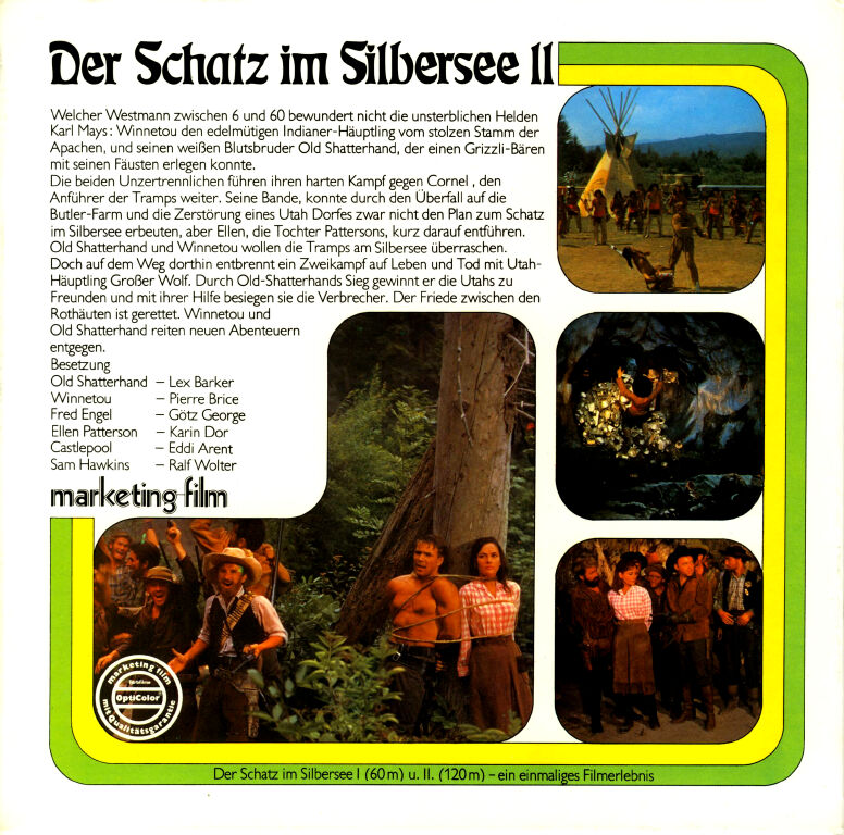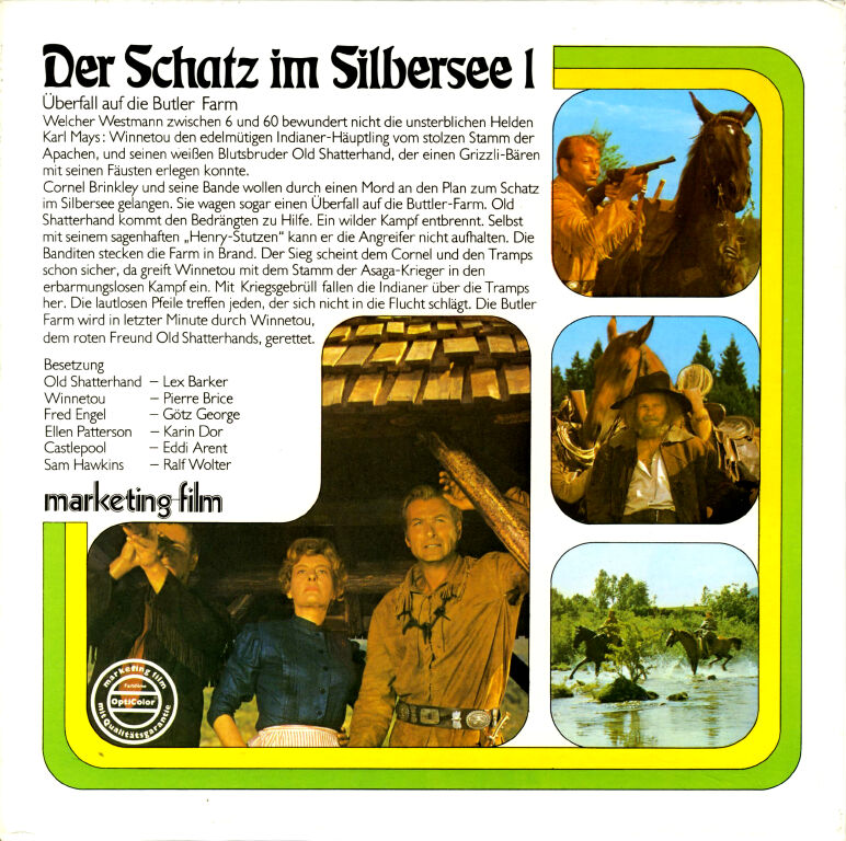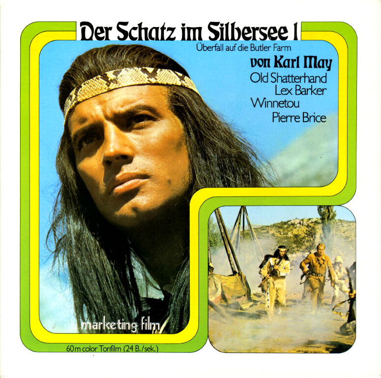 1973 von marketing-film herausgebracht, bis in die 80'er Jahre nachkopiert. Dadurch gibt es Fassungen in Azetat und Polyester. Zuerst erschien die 120m Fassung und etwas später eine zusätzliche 60m Fassung, die vor die 120m Fassung gekoppelt werden kann. Nach dem marketing-film Logo folgt nur die Titeltafel in Vollbild und danach gehts im Balkenbild weiter. Der Schnitt ist etwas hart angelegt, aber verständlich. Die 60m Fassung zeigt den Überfall auf die "Butler-Farm", die 120m Fassung quasi den Rest des Films bis hin zum Finale und dem Original Ende. Wie bereits erwähnt wurde mit Balken kopiert. Da marketing aber einen größeren Balkenbildausschnitt gewählt hat und nicht das gesamte CinemaScope Bild zu sehen ist, kommt es oft vor das wir Stimmen von Schauspielern hören die nicht im Bild zu sehen sind. So zum Beispiel im Lager der Utah's, wo Old Shatterhand gegen den Häuptling kämpfen muss. Ärgerlich! Die 35mm Vorlage vom Constantin-Filmverleih war hier nicht ganz Einwandfrei - man sieht einige Klebestellen und Stanzmarken. Die Farben sind für die vorliegende Azetat-Kopie sehr gut und auch der Ton ist klar und deutlich aufgespielt. Nur die Bildschärfe ist nicht besonders gut, was sich bei totalen Aufnahmen negativ auswirkt. Für einen gemütlichen Filmabend jedoch Empfehlenswert! Der Trailer zur Wiederaufführung ist ebenfalls auf Super 8 in CinemaScope erhältlich!
