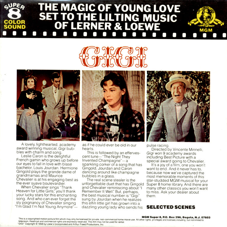 Nach dem MGM-Löwen folgt die gekürzte Betitelung, ehe Maurice Chevalier "Thank Haven For Little Girls" zum besten gibt. Die Bildschärfe ist befriedigend, ab und zu muss nachgestellt werden. Umkopiert von Scope auf Normalbild, wobei nicht mit Pan & Scan gearbeitet wurde. Der Ton ist zwar laut aufgespielt, jedoch mit etwas zu viel Höhen - mehr Bässe wären vom Vorteil gewesen. Dadurch wirkt er etwas dünn. Die Farben dieser Kopie sind bereits rot angehaucht und werden deshalb nicht bewertet. Übrigens zeigt der Film viel mehr die Musiktitel, als Handlung, ist aber trotzdem schön anzusehen. So sehen und hören wir ausserdem noch die Titel "The Night They Invented Champagne", "I Remember It Well", "I Dont Understand The Parisians" und "Gigi", das Louis Jordan aus Herz und Seele singt. Der Trailer ist ebenfalls auf Super 8 in CinemaScope [englisch] erhältlich!