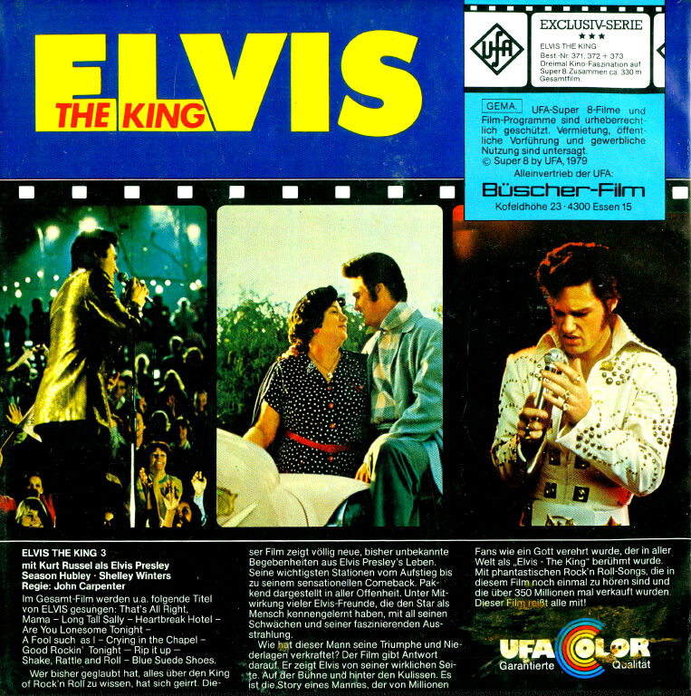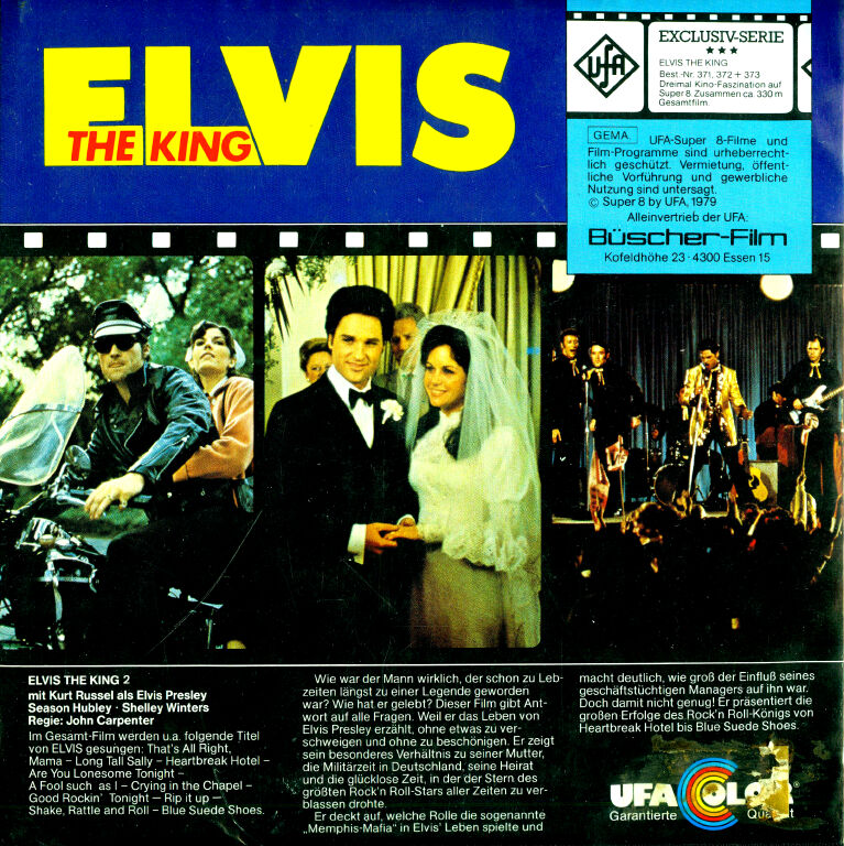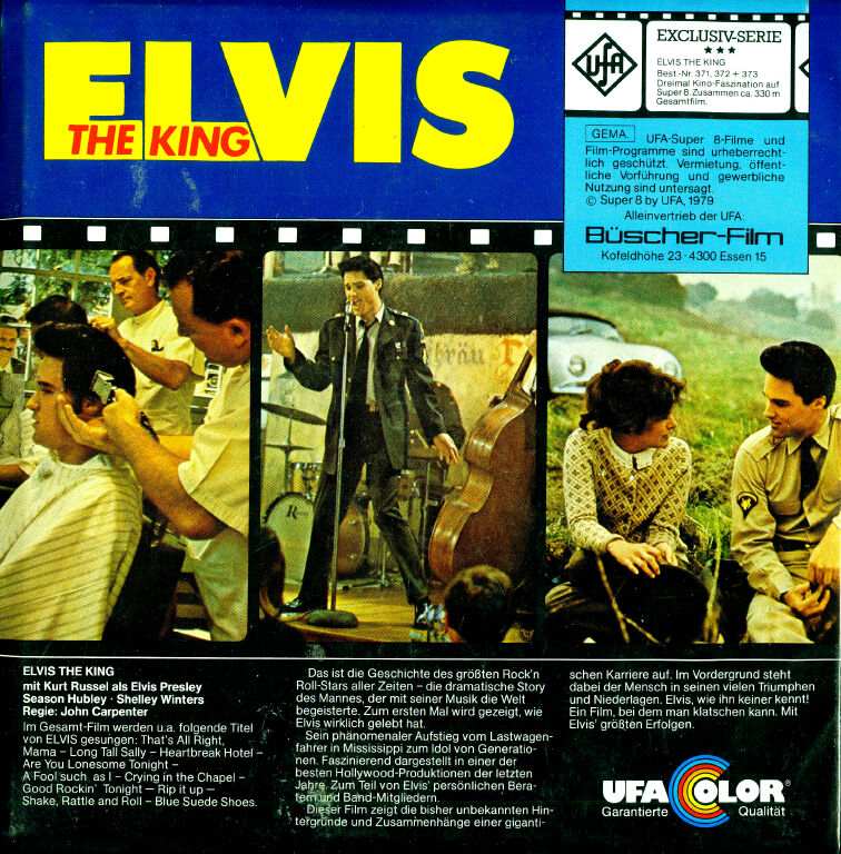 Erschien bereits 1979 kurz nach dem deutschen Kinostart auf Super 8. Trotz massiver Kürzungen zeigt diese Schnittfassung alle wichtigen Stationen aus dem Leben von Elvis. Ein Lob an den UFA-Schnitt-Meister. Es ist erstaunlich, wie viele Elvis-Titel hier zu finden sind. Okay - die meisten sind gekürzt, aber trotzdem noch in guter Länge - und bei einigen war das auch im Original-Film schon so. Die Filmhandlung bleibt erhalten und ist durchweg nachvollziehbar. Zunächst geht es mit dem (meines Erachtens fast ungekürzten) Original-Vorspann los, bevor das UFA-Logo und die (sehr gut gekürzte) Original-Betitelung folgt, sowie die ersten interessanten Szenen des Filmes. Die Untertitel mit Ort und Zeit der Stationen sind durchweg deutlich lesbar. In Akt 2 und 3 befinden sich am Anfang lediglich kurze Texttafeln. Hier werden keine Filmmeter auf Kosten der Musik verschwendet! Die interessantesten Szenen und das (gekürzte) Original-Ende haben auf jeden Fall Einzug gefunden.
