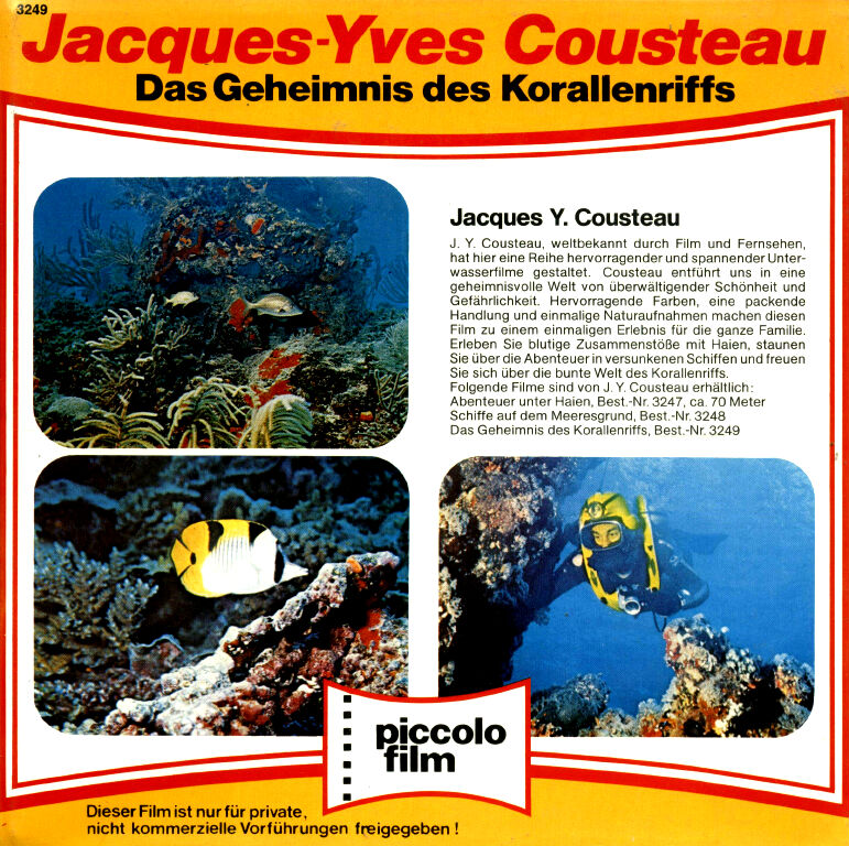 Weitere Anmerkungen: Die Filmhülle zeigt Fotos die eigentlich zur berühmten Cousteau Fernsehserie "Geheimnisse und Rätsel des Meeres", die in den 70er Jahren im deutschen Fernsehen lief. In Wirklichkeit besteht der Film aus Sequenzen, die dem 1954/55 produzierten Kinofilm "Schweigende Welt" entnommen wurden.