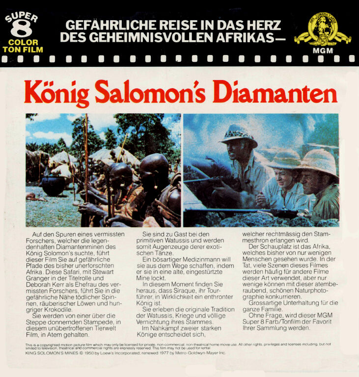 Erschien 1977 bei MGM Super 8 und wurde im gleichen Jahr von marketing-film in Deutschland vertrieben. Nach dem MGM-Löwen folgt die gekürzte Betitelung (dicke Letter ziehen von rechts nach links vorbei), ehe wir in die Handlung eintauchen. Die Bildschärfe ist befriedigend und der Ton hätte mehr Bässe vertragen können. Einzig allein überzeugen die grandiosen Farben. Die Schnittfassung ist gut gemacht und man wird bestens Unterhalten, wobei einige Lacher vom Publikum nicht ausbleiben (z.B. die schwarze Spinne, die 'deutlich erkennbar' von einem Faden gezogen wird!). Übrigens ist das Cover-Bild der deutschen Fassung spiegelverkehrt.