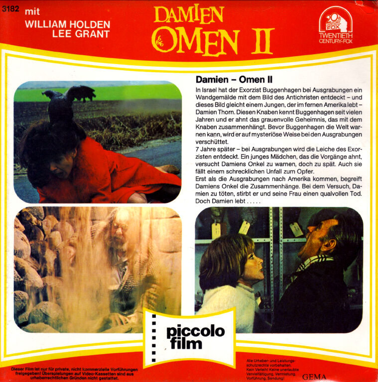 Nachdem uns das piccolo-film Logo auf den Film einstimmt, folgt das 20th Century Fox-Logo und es beginnt schon das Titelthema - also keine Fanfare. Der ganze Film hat ein ausgezeichnetes Balkenbild, schöne Farben und eine gute Schärfe. Der Ton ist etwas zu dumpf und hätte mehr höhen vertragen können. Leider liegt mir zur Zeit keine andere Kopie des Films vor. Es ist möglich, das meine Kopie vom Ton her deshalb nicht ganz in Ordnung ist. Die Schnittfassung von piccolo-film unterscheidet sich auch stark von der amerikanischen Ken-Films Super 8 Fassung und beinhaltet z.T. andere Szenen. Empfehlenswerte Schnittfassung für Horrorfans.