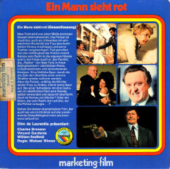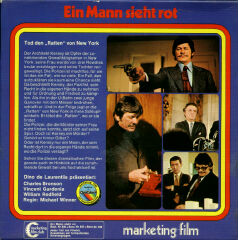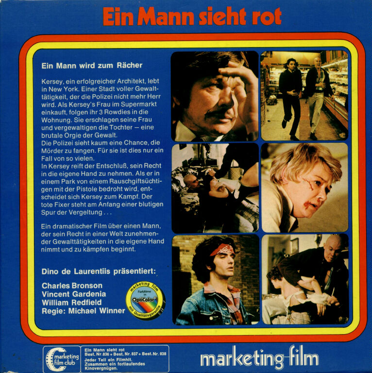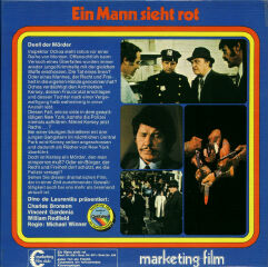 marketing-film veröffentlicht 'Ein Mann sieht rot" im Frühjahr 1975 als Dreiteilige Schnittfassung und - damit auch der weniger Verdienende es sich leisten konnte - als Einteilige Gesamtfassung (150m) zu damals stolze 189.- DM. Zuerst zum Dreiteiler: Hier hat der Schnittmeister tolle Arbeit geleistet! Wenn man ihn gesehen hat, vermisst man absolut nichts. Alle wichtigen Szenen sind enthalten und es macht Spaß 'Charles Bronson' auf der Leinwand ballern zu sehen. Die Bildschärfe (Vollbild) ist gut, dennoch gibt es ein paar Szenen gegen Ende der einzelnen Akte, die unscharf erscheinen. Die Farben sind durch die des Kinofilms sowieso etwas bedachte Farbgebung eher dunkel oder sogar düster gehalten. Der Ton ist kräftig aufgespielt. Alles in allem einen Klasse Schnittfassung! Und nun zur Gesamtfassung: Auch diese ist perfekt gekürzt, beinhaltet aber nur Szenen, die auch für den Dreiteiler verwendet wurden. Klar das es hier schneller zur Sache geht. Aber auch diese Fassung ist Sehenswert! Natürlich sollte man den Dreiteiler vorziehen.