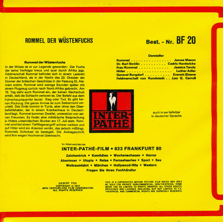 Inter-Pathé übernahme von Ken-Films. Der Film startet sofort mit dem Titel des Films und steigen in die Handlung ein. Zu sehen ist nur der letzte Befehl, den Rommel erteilt, bis hin zum tragischen Ende. Durch diesen etwas krassen Schnitt geht dem vielgelobten Film viel verloren. Die Bildschärfe ist befriedigend, die Graustufen sind in Ordnung. Der Ton ist klar und laut aufgespielt, jedoch an mehreren Stellen leider A-Synchron.