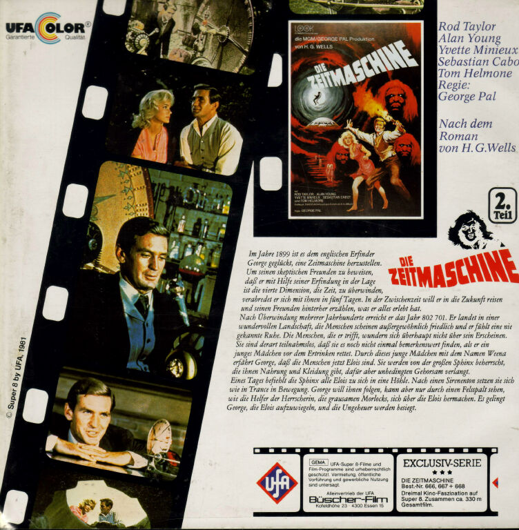 UFA brachte 1981 in ihrer Super 8 Endphase diesen Si-Fi Klassiker heraus. Nach dem originalen Titel in gekürzter Form, geht es auch schon los. Und das alles erleben wir als Zuschauer in guten Farben, guter Schärfe und einem hervorragenden Schnitt, welcher perfekt angelegt ist und nichts vermissen lässt. Vom Start der Zeitreise in Georges Wintergarten, über den Halt im Jahr 1917 & 1966, hin zur Landung im Jahr 802 701, der Rettung Weenas aus dem Wasser und dem Kampf mit den Morlocks sind alle wichtigen Szenen enthalten. Sogar der original Endtitel ist enthalten, nachdem allerdings auch schon abgeblendet wird. Insgesamt eine sehr schöne und wunderbare Schnittfassung, welche sehr gesucht ist und zur ebenfalls erhältlichen Komplettfassung eine sehr gute Alternative ist. Somit ist 'Die Zeitmaschine' ein seltener Super 8 Klassiker, der in jede Sammlung gehört. Übernahme von Ken-Films.