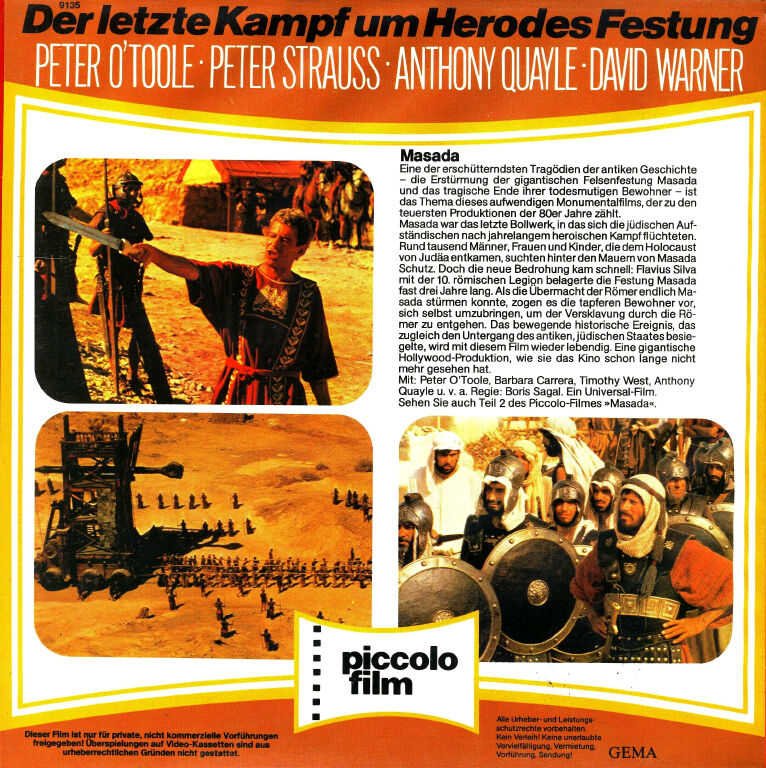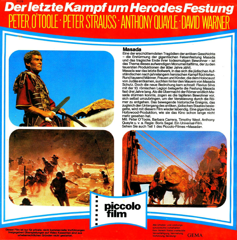 hat eine gute Bildschärfe. Der Ton ist klar und laut aufgespielt. Die Farben kommen noch voll heraus, obwohl viele Szenen in der Wüste oder in der Nacht spielen. Der Schnitt des Films kommt schnell zur Sache. Die Frage ist nur, warum piccolo-film hier einen Zweiteiler heraus gebracht hat, denn der Film floppte seiner Zeit an den deutschen Kinokassen. Der Text auf der Coverrückseite 'Eine gigantische Hollywood Produktion, wie sie das Kino schon lange nicht mehr gesehen hat!' darf als guter Witz angesehen werden, da es sich hier ja um einen Zusammenschnitt der TV-Serie handelte. 'Masada' wurde dementsprechend nicht sehr oft verkauft!