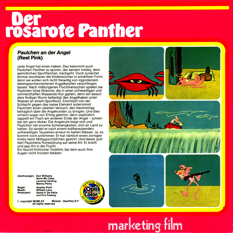 marketing-film veröffentlichte 12 Pink Panther Cartoons aus den 1960'er Jahren in einer Extra rosa Verpackung. Das Titelbild wurde von den Mannen bei marketing-film selbst gemalt. Die Bildmotive auf der Coverrückseite sind Fotos direkt vom Filmstreifen (leider Seitenverkehrt). Knallige Farben, gute Bildschärfe und ein laut aufgespielter Ton sorgen für 6 Minuten köstliche Unterhaltung! Der Cartoon ist in seiner ungekürzten Fassung zu sehen! Rarität!