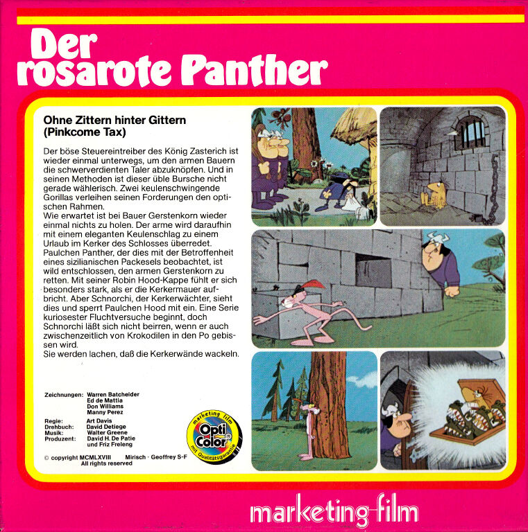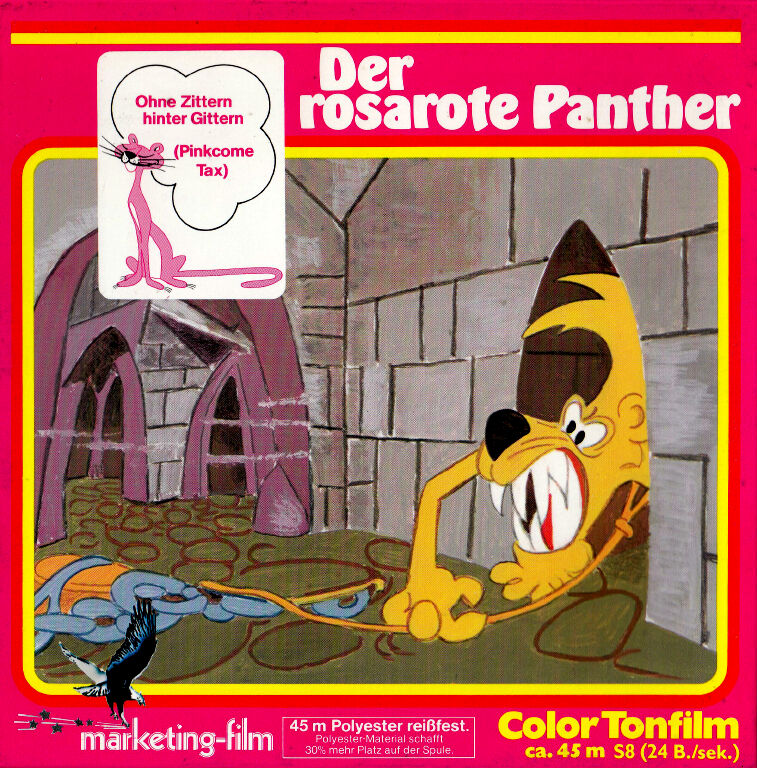 marketing-film veröffentlichte 12 Pink Panther Cartoons aus den 1960'er Jahren in einer Extra rosa Verpackung. Das Titelbild wurde von den Mannen bei marketing-film selbst gemalt. Die Bildmotive auf der Coverrückseite sind Fotos direkt vom Filmstreifen. Knallige Farben, gute Bildschärfe und ein laut aufgespielter Ton sorgen für 6 Minuten köstliche Unterhaltung! Der Cartoon ist in seiner ungekürzten Fassung zu sehen! Rarität!