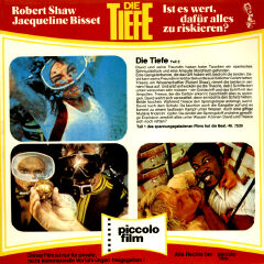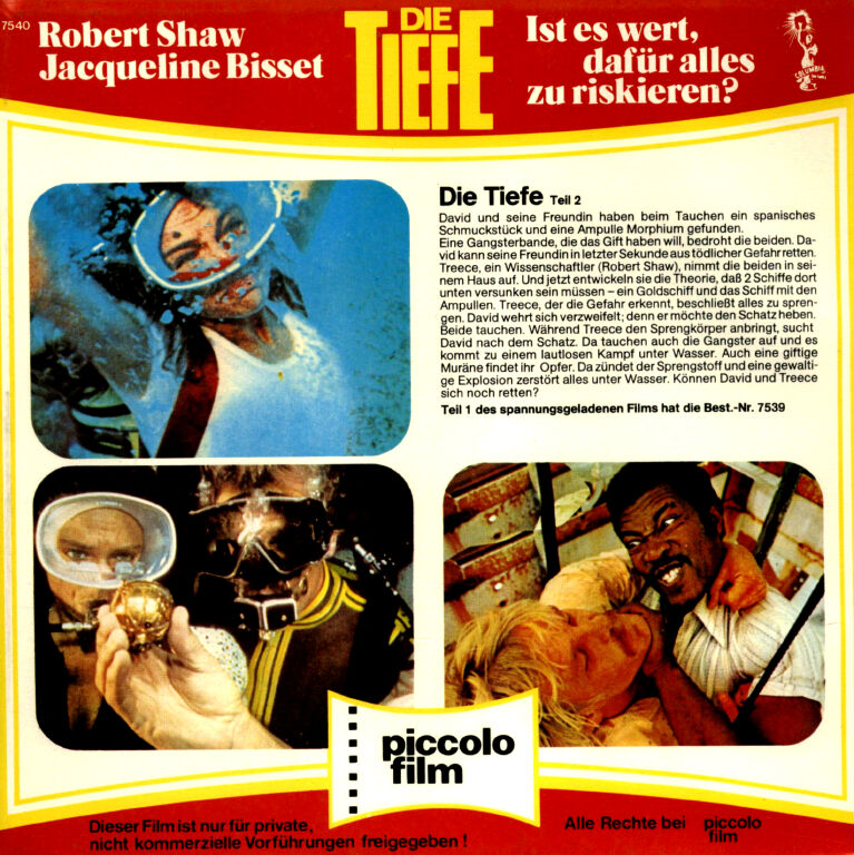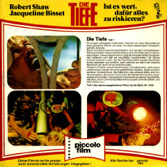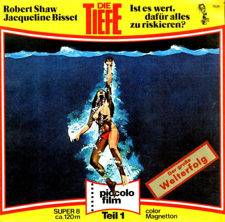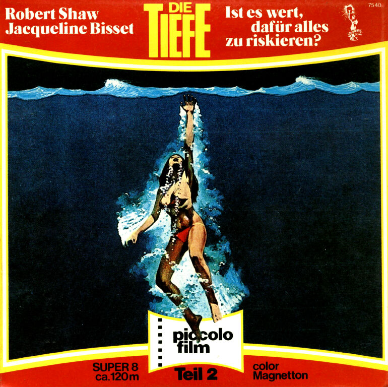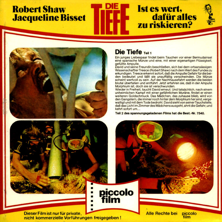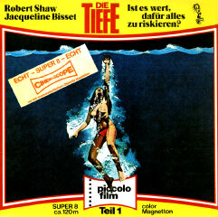 1979 erschien bei piccolo-film die Zweiteilige Balkenbild-Fassung. Etwa 2 Jahre später setzte piccolo-film noch eins drauf, in dem sie den Zweiteiler auch in CinemaScope (gequetschtes Bild - nur mit entsprechender Vorsatz-Optik entzerrend abspielbar!) herausbrachten. Diese CinemaScope Fassung wird hier auch rezensiert: Der Film ist Vorzüglich geschnitten, enthält viele herausragende Szenen, hat einen brillianten Ton und sehr schöne Farben. Auch in der Helligkeit, gerade in den Unterwasser Szenen, ist das Bild einfach Top! Die Bildschärfe der Scope-Fassung ist noch mit "gut" bewertbar. In einigen Filmzeitschriften der 80er Jahre war damals zu lesen, das viele Filmfreunde sich den Stereo-Ton der REVUE-Film Balkenbild-Fassung auf diese piccolo-film Scope-Fassung überspielten und somit zum breiten Bild auch noch einen guten Stereo-Ton dazu hatten. Da die REVUE-Filme ja von piccolo-film hergestellt wurden, kommt wieder einmal die Frage auf, warum piccolo-film diesen Scope-Film nicht gleich in Stereo auslieferte. Bleibt für immer in meiner Sammlung!
