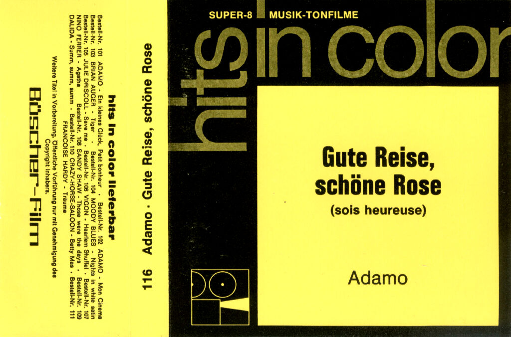 Büscher-Film, später UFA-ATB, präsentierte mit der Serie "HITS IN COLOR" diverse Musiktitel. Auch dier Musik-Clip lädt zum schmunzeln ein. 'Adamo' singt in einem Einkaufszentrum (u.a. auf fahrender Rolltreppe) seinen Hit, allerdings in der französischen Version. Der Ton ist klar und laut aufgespielt, die Bildschärfe ist gut und die tollen Farben sorgen für 3 Minuten gute Unterhaltung!