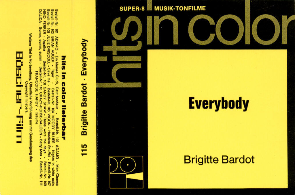 Büscher-Film, später UFA-ATB, präsentierte mit der Serie "HITS IN COLOR" diverse Musiktitel. Eigentlich ein langweiliger Clip. Nur Sehenswert wegen 'Brigitte Bardot'. Der Ton ist klar und laut aufgespielt, die Bildschärfe ist gut. Lediglich die Farben sind rot angehaucht.