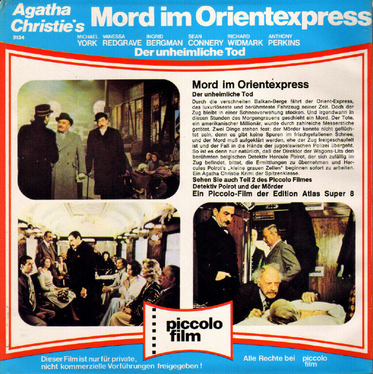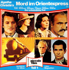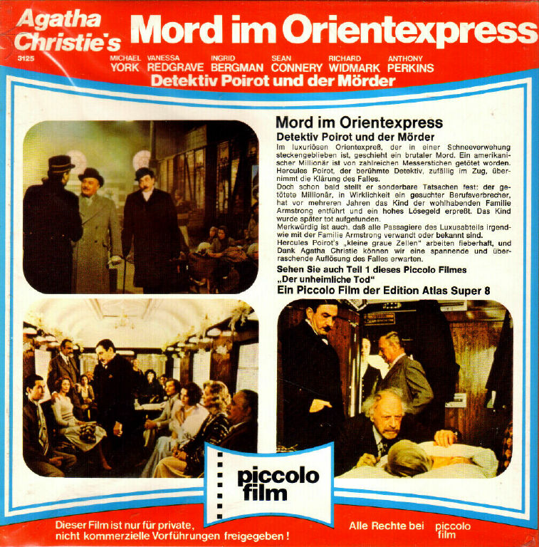 Seltene und sehr gut geschnittene Kopie, die im ersten Teil alle wichtigen Personen einführt und im zweiten Teil die Aufklärung des Mordes zeigt. Obwohl auch der Name von Sean Connery auf der Packung steht, so taucht er nur so "nebenbei" mal kurz auf und spielt auch keine größere Rolle in dieser Schnittfassung. Vom Schnitt her gibt es aber insgesamt nichts zu beanstanden, denn dieser ist sehr gut, auch wenn knapp 32 Minuten einer Originallaufzeit von 120 Minuten gegenüber stehen. Die Qualität ist absolut Top, was sich in einer guten Schärfe und einem ruhigen Bildstand zeigt. Die Farben sind etwas blass und bereits mit einem Stich ins rötliche versehen, passen aber gut zur Atmosphäre dieses Klassikers. Eingeleitet wird der Film mit dem atlas-Logo, gefolgt von selbst gestalteten Titeltafeln von piccolo-film. Teil 2 wird mit der gleichen Titelsequenz eingeleitet, nur ergänzt durch einen Hinweis auf den zweiten Teil. Spannung und Atmosphäre sind in dieser Schmalfilmfassung garantiert.