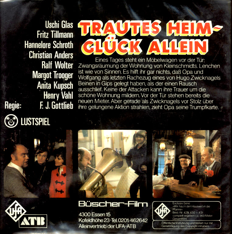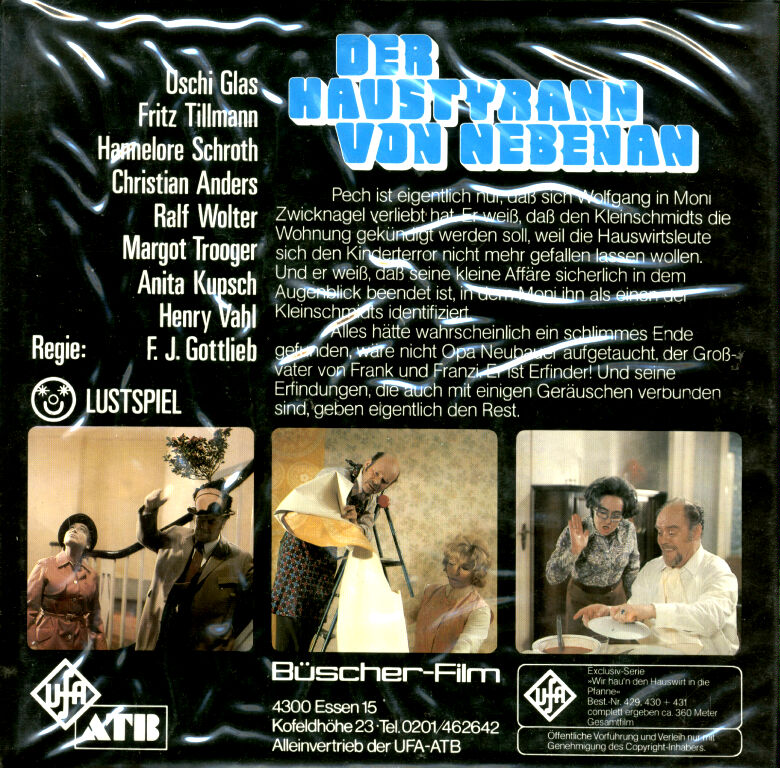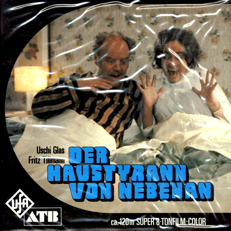 Seltene, sehr gut geschnittene und mit einer Laufzeit von 50 Minuten vollkommen ausreichende Kopie aus dem Hause UFA. Die Story bietet das, was man von einer "Klamotte" aus den frühen 1970'ern erwartet. Wolfgang Kleinschmidt, gespielt von Christian Anders, Sohn der Familie Kleinschmidt verliebt sich in "Schätzchen" Uschi Glas, die wiederum die Tochter der Hausbesitzer Zwicknagel ist, welche vor allem jene Familie Kleinschmidt die Wohnung kündigen will. Obwohl die Farben in Richtung goldbraun tendieren, so besitzt diese Fassung eine sehr gute Schärfe und einen ruhigen Bildstand. Der Ton ist klar, laut und kräftig aufgespielt. Seltsamer Weise wird der 3 Teiler selten angeboten und wenn meist nur einzelne Teile in s/w, wie er auch alternativ zu haben war. Beim stöbern im Internet zum Thema Super 8 ist oft zu lesen, dass die Bestellnummern dieser Kopie nicht vergeben wären.
