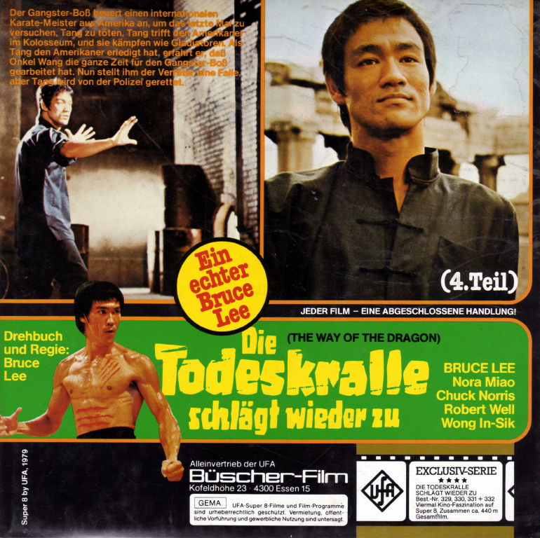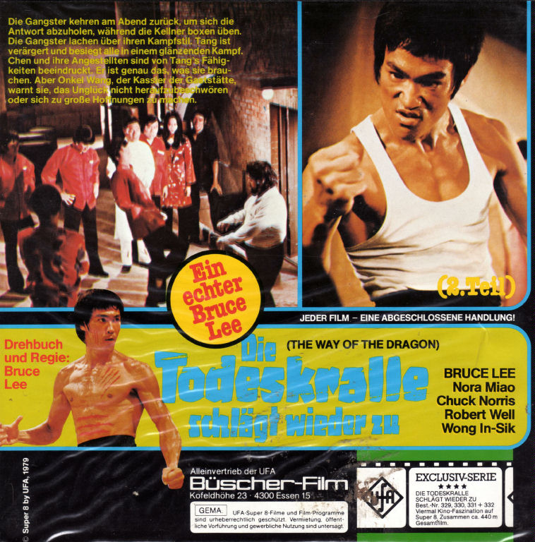 Ein weiterer Bruce Lee Vierteiler aus dem Hause UFA. Die originale Titelsequenz wurde gekürzt übernommen und die Handlung startet am Flughafen. Kopiert mit größeren Balken, zeigt sich das Bild mit rötlichen Farben. Die Bildschärfe ist ein Kapitel für sich, denn ist diese in den ersten drei Teilen noch gut, schwankt jedoch im letzten Teil zwischen verschwommen und milchig. Es taten richtig die Augen weh, so stark schwankt die Schärfe in diesem Teil. Ob dies bei allen Kopien dieser Auflage so ist, kann ich nicht bestätigen. Insgesamt ist der Schnitt gut angelegt und zeigt in 62 Minuten einen stimmigen Handlungsverlauf. Für richtige Bruce Lee Fans sicher ärgerlich, da viele Kampfszenen fehlen. Wer aber auf gutes 1970er Jahre Kino steht und sich einen spannenden Film ins Heimkino holen möchte, dem sei dieser Film empfohlen.