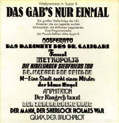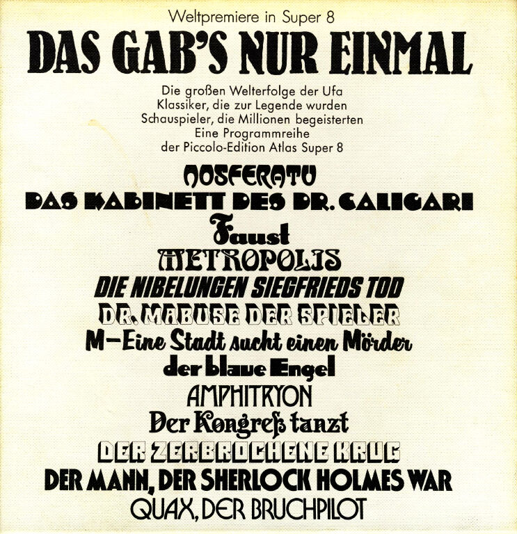 Eine piccolo-film/Edition Atlas Super 8 Veröffentlichung. Der Einteiler startet mit dem Logo, gefolgt von der „alten“ Titelsequenz, die augenscheinlich vollständig sein müsste. Ein Vergleich mit der restaurierten DVD ergab, dass die DVD mit einer neuen Titelsequenz versehen ist. Kopiert wurde in Vollbild mit deutschen Texttafeln. Bildstand, Schärfe und Kontrast sind für einen Film aus dem Jahre 1922 durchaus gut. Auch der Bildstrich ist stabil, es muss nicht nachreguliert werden. Die Musikuntermalung zum Film wurde sauber und klar aufgespielt. In der Titelsequenz war zu lesen, dass es sich um die neue Musikfassung handelt. Der Schnitt ist verständlich und logisch angelegt, hier gibt es nichts zu bemängeln. Kein Abspann vorhanden, es wurde mit der letzten Szene abgeblendet, gefolgt vom „ENDE“ Zeichen. piccolo-film/Edition Atlas Super 8 veröffentliche auch eine Komplettfassung. Diese wurde jedoch nur in schwarzen Hüllen mit „Atlas-Aufdruck“ ohne Covermotiv ausgeliefert.