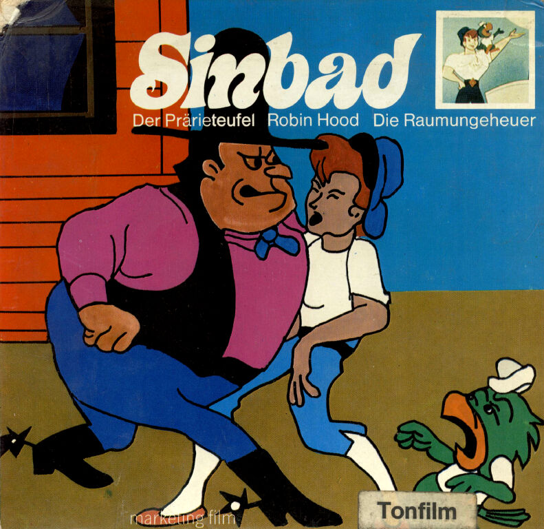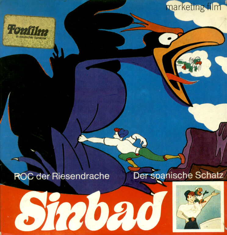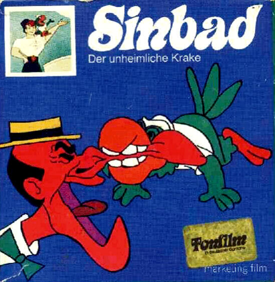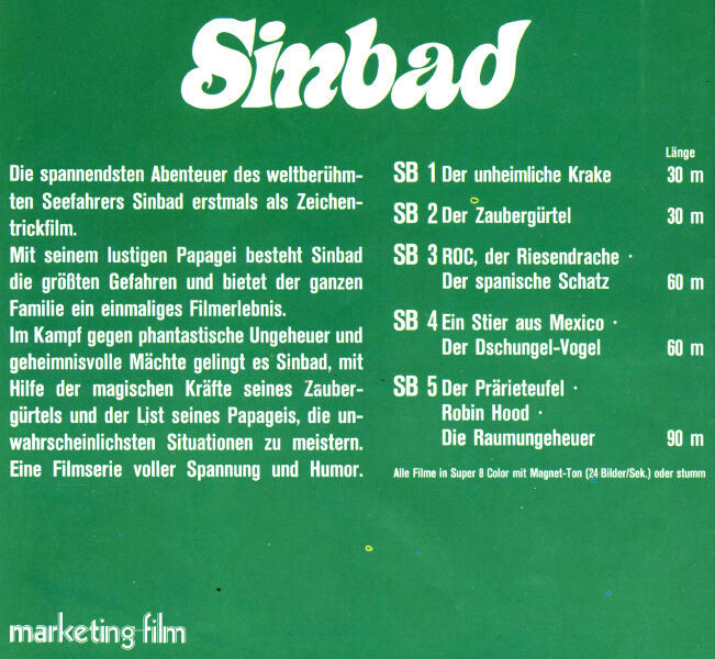 marketing-film präsentiert hier quasi in deutscher Erstveröffentlichung insgesamt 9 Abenteuer auf Super 8. Statt den Helden nun "Sindbad" zu nennen, beließen es die Mannen der Bochumer Firma einfach bei "Sinbad". Im Katalog 1973 (wahrscheinlich mit Druckfehler) "Sinnbad". Da die TV-Serie nie im deutschen TV lief, mussten die 9 Cartoons synchronisiert werden. Und zwar in einer - wie in dieser Zeit leider üblichen Methode - sehr schlechten und schlichten Synchro. Die fünf Rollen verkauften sich auch nicht so gut und oft und verschwanden 1975 wieder aus dem Programm. Für Sammler und Liebhaber der marketing-film Veröffentlichungen sind diese fünf Rollen allerdings Pflicht. Für diese Rezension lag leider nur eine Rolle aus der Serie vor (SB 3), bei der schon der Vorspann und der Titel fehlten. Immerhin hatte diese Kopie noch gute Farben mit einer befriedigenden Bildschärfe und laut aufgespielten Ton. Von REVUE-Film gab es nur eine 120m sw/stumm Fassung, die 4 Abenteuer zeigt. Komischer Weise heißt bei REVUE-Film dieser dann "Sindbad" der Seefahrer und dem Untertitel "Robin Hood und der Stier aus Mexiko im Dschungel".