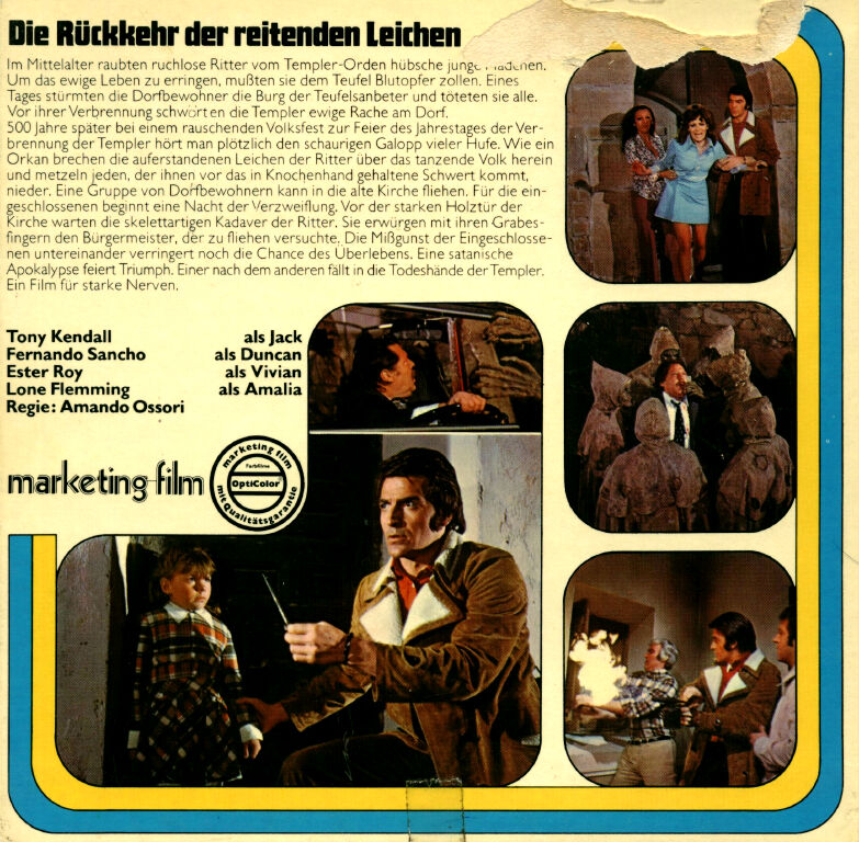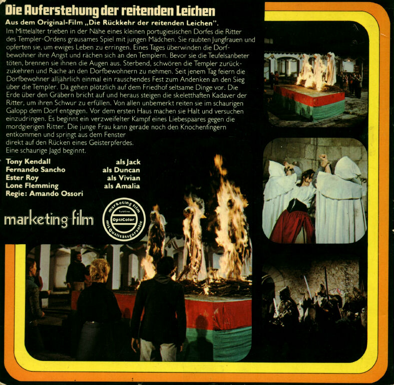 Spannender marketing-film Zweiteiler aus frühen Tagen. Der Film startet mit dem alten marketing-film Logo, gefolgt von einer kurzen Titeleinblendung. Kopiert wurde in Vollbild. Bildstand und Ton entsprechen dem damaligen Standard und sind mit gut zu bewerten. Die Bildschärfe ist leicht grobkörnig, aber noch befriedigend. Einen Abspann gibt es nicht, es wird mit der letzten Szene abgeblendet. Zur farblichen Bewertung: die 90 Meter Fassung wurde auf AGFA kopiert und weist keine Farbveränderung auf, die 120 Meter Fassung ist leider immer auf Eastman gezogen und dementsprechend vom Rotstich befallen. Der Filmschnitt ist sehr gut angelegt, es bleibt gruselig und spannend. Wer die beiden Teile koppeln möchte, sollte folgendes beachten: Teil 1 (Nr. 832 "Die Auferstehung der reitenden Leichen" 90m), Teil 2 (Nr. 815 "Die Rückkehr der reitenden Leichen" 120m), hier müssen noch ca. 3 bis 4 Meter des Anfangs (Rückblendeszene) weggeschnitten werden, da diese Szenen bereits in Teil 1 vorhanden sind. [Ha.Ka.]