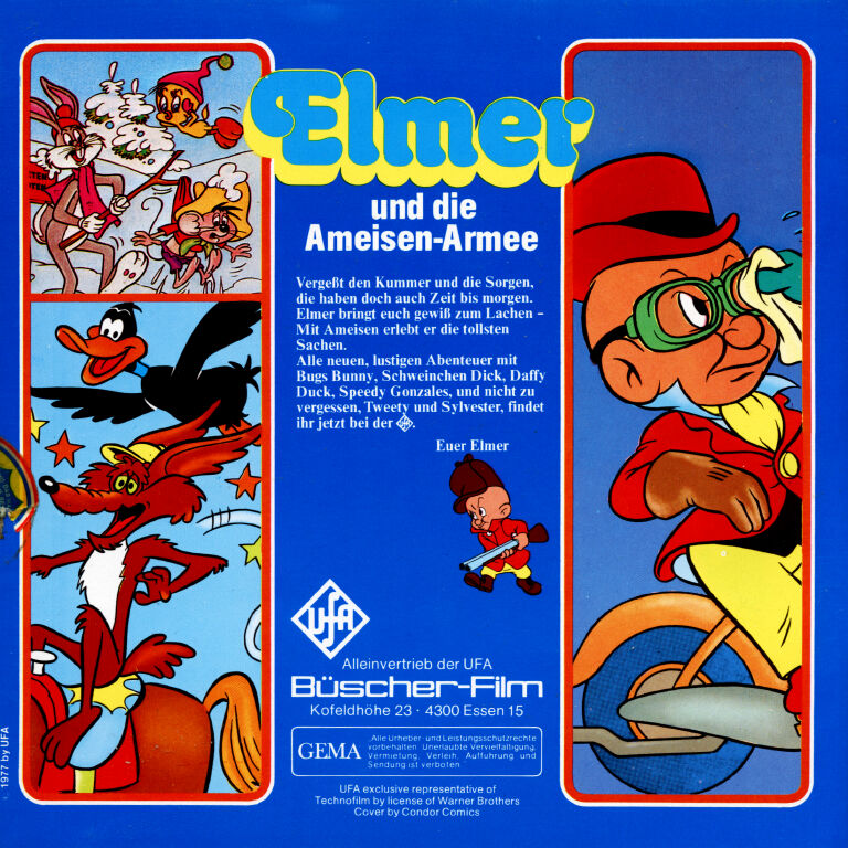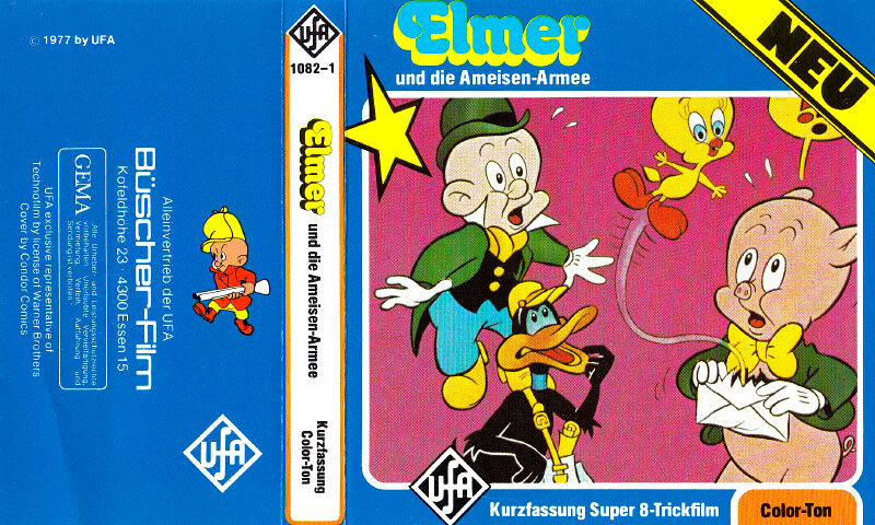 UFA präsentiert insgesamt 30 'Looney Tunes' Cartoons der Warner Bros. auf Super 8, den UFA von der italienischen Techno-Film lizensierte. Dort wurden diese auch kopiert. "Denn daß sich jetzt Profis um das Bugs Bunny-Programm kümmern, wird auch an dieser neuen Aufmachung deutlich"! Genau so heißt es im Bugs Bunny Flyer der UFA von 1977. Damit wollte UFA klar machen, das ihre Cartoons sich stark von den vorher bei piccolo-film erschienenden Fassungen unterscheiden. Damit ist wohl die gute Synchronisation gemeint. In der Tat sind die Color Filme von guter Qualität, während die Schwarz-Weiß Fassungen z.T. mehr als schlecht waren. Die Bildschärfe ist gut, der Ton laut aufgespielt und auch die Farben sind Klasse! Der Aufdruck "Original-Fassung" irretierte einige Käufer, den damit war die Länge gemeint und nicht, das der Cartoon in seiner amerikanischen Sprache präsentiert wird. Die Warner Cartoons hatten in der Regel immer eine Laufzeit von 6 - 7 Minuten, was in etwa 40m - 45m entspricht. Somit war es der UFA möglich, noch sogenannte Kompilations-Rollen anzubieten: die 120m Fassung beinhaltete drei Cartoons und die 80m Fassung dagegen zwei. Alle Cartoons hatten je nur eine Haupttonspur; auf die Ausgleichsspur wurde verzichtet. Zu dem erschien jeder Cartoon auch noch in Schwarz-Weiß, mit oder ohne Ton und auch für den kleinen Geldbeutel als 17m Kurzfassung, ebenfalls mit oder ohne Ton, in Color oder Schwarz-Weiß.
