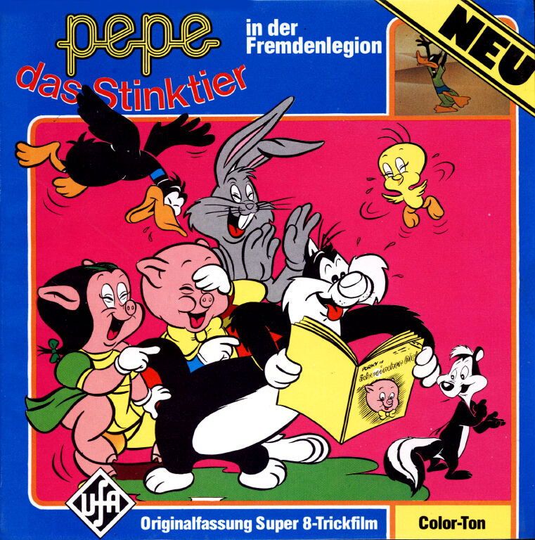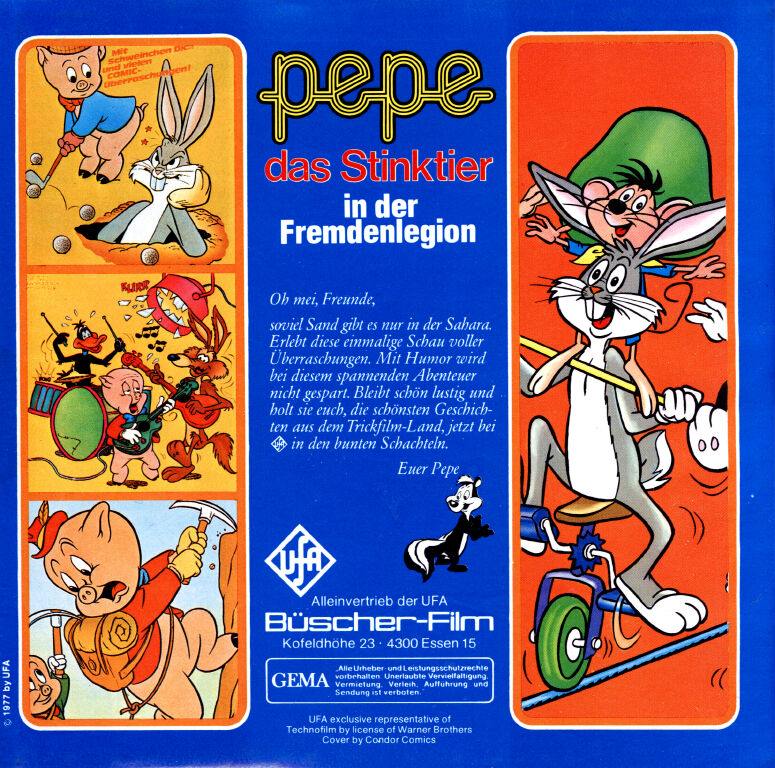 UFA präsentiert insgesamt 30 'Looney Tunes' Cartoons der Warner Bros. auf Super 8, den UFA von der italienischen Techno-Film lizensierte. Dort wurden diese auch kopiert. "Denn daß sich jetzt Profis um das Bugs Bunny-Programm kümmern, wird auch an dieser neuen Aufmachung deutlich"! Genau so heißt es im Bugs Bunny Flyer der UFA von 1977. Damit wollte UFA klar machen, das ihre Cartoons sich stark von den vorher bei piccolo-film erschienenden Fassungen unterscheiden. Damit ist wohl die gute Synchronisation gemeint. In der Tat sind die Color Filme von guter Qualität, während die Schwarz-Weiß Fassungen z.T. mehr als schlecht waren. Die Bildschärfe ist gut, der Ton laut aufgespielt und auch die Farben sind Klasse! Der Aufdruck "Original-Fassung" irretierte einige Käufer, den damit war die Länge gemeint und nicht, das der Cartoon in seiner amerikanischen Sprache präsentiert wird. Die Warner Cartoons hatten in der Regel immer eine Laufzeit von 6 - 7 Minuten, was in etwa 40m - 45m entspricht. Somit war es der UFA möglich, noch sogenannte Kompilations-Rollen anzubieten: die 120m Fassung beinhaltete drei Cartoons und die 80m Fassung dagegen zwei. Alle Cartoons hatten je nur eine Haupttonspur; auf die Ausgleichsspur wurde verzichtet. Zu dem erschien jeder Cartoon auch noch in Schwarz-Weiß, mit oder ohne Ton und auch für den kleinen Geldbeutel als 17m Kurzfassung, ebenfalls mit oder ohne Ton, in Color oder Schwarz-Weiß.