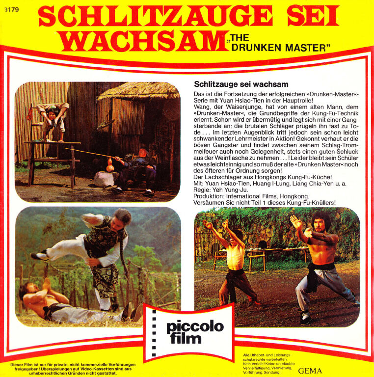 Der kleine Wang ist der Schrecken seiner Stadt, denn mit seinen Scherzen hat er schon viele Einwohner an den Rand der Verzweiflung gebracht. Deswegen nennen ihn auch alle "Schlitzauge". Eines Tages treibt es Wang allerdings zu weit, und wird von einer Gangsterbande verfolgt. In letzter Minute eilt ihm der "Drunken Master" zu Hilfe, und nimmt das kleine Schlitzohr unter seine Fittiche. Das Training ist hart und gnadenlos, und so lernt Wang bei der Schnapsnase alle Tricks der asiatischen Kampfkunst. Das "Schlitzauge" wird nie wieder vor jemandem fliehen müssen ... [Text: Videomarkt]