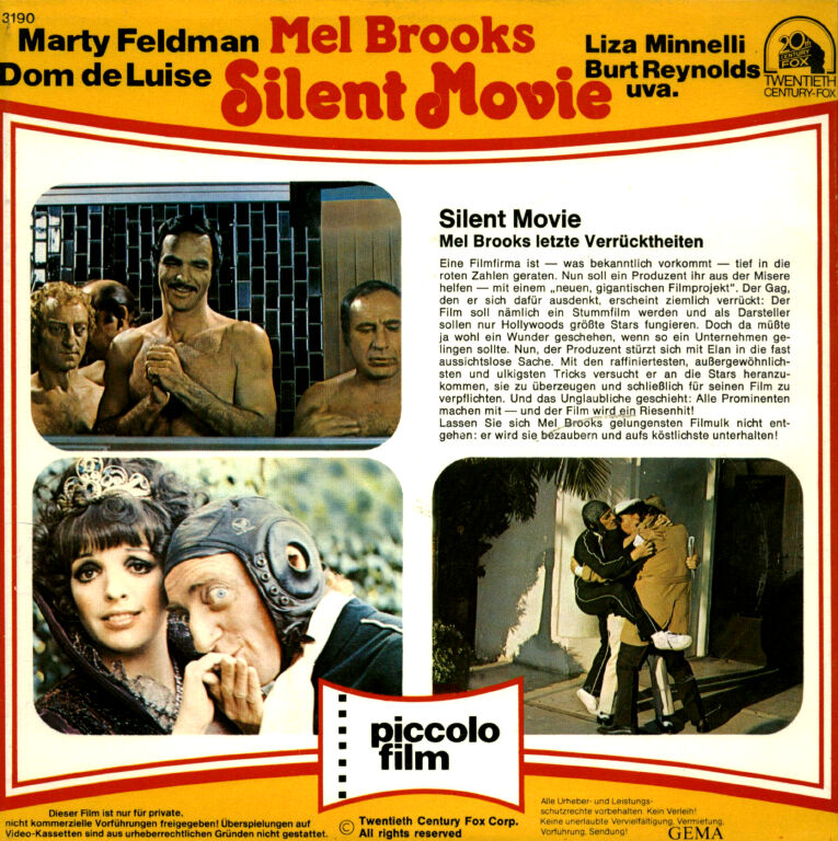 Den Film zu Rezensieren ist schwierig. Warum ? piccolo-film hat den 87 Minuten langen Film auf 17 Minuten gekürzt und es stellt sich hier die Frage, warum die Cutter von piccolo-film gerade die doch etwas blöde Szene mit Liza Minelli verwendeten, statt die herausragende Renn-Szene mit Paul Newman. Für die jenigen, die den Film noch nicht gesehen haben: Mel Brooks dreht im Zeitalter des Tonfilms einen Stummfilm, aber den darf er nur machen, wenn er die größten Spitzenstars von Hollywood dafür bekommt. Der Film schildert nichts weiter, als das Mel mit seinen beiden Kumpels versucht, diese Anzuwerben. Die Szene mit Burt Reynolds in der Dusche ist ja O.K., aber danach noch die zweite Szene mit ihm zu zeigen, ist vergeudete Zeit. Danach wird Liza Minelli angeworben und schon sind wir kurz vor Ende des Films, wobei die Premiere des Stummfilms mißlingt und der Film geklaut wird. Natürlich holt sich Mel den Film zurück und alles wird gut. Ende! Die Szenen mit Paul Newman, der auch auf der piccolo-film Packung auf der Seite angegeben ist, jedoch in der Schnittfassung nicht zu sehen ist, gehört mit zu den besten, was jemals gedreht worden ist. Man muß das gesehen haben. Wer ein Fan von Filmen Mel Brooks ist, sollte sich diesen unbedingt zu legen. Dem Betrachter wird durch die deutsch eingeschnittenen Titel (genau wie beim Stummfilm) etwas gefordert. Wäre es sinnvoll gewesen diesen Film NUR als Stummfilm anzubieten ? Nein, den das was der Zuschauer hört, sind Musik und Geräusche. Die Geräusche geben manchen Szenen die Pointen. Mein Tipp: es sollte sich jeder seine eigene Meinung bilden und den Film sich mal anschauen. Lachsalven garantiert er jedoch ganz bestimmt (die Szene mit dem Cola-Automat und Burt Reynolds unter der Dusche!).