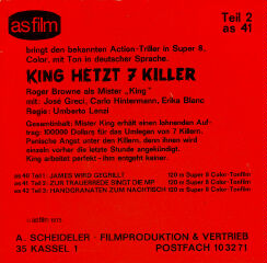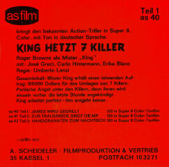 Seltener Dreiteiler von as-Film von 1975, denn meistens tauchen nur Einzelteile auf. Der Film schwimmt ein bisschen auf der Kommissar-X Welle und macht echt Spaß. Ist super geschnitten und man kann der Handlung gut folgen. Beim kopieren muss eine gebrauchte Vorlage benutzt worden sein, einige Hacker, Laufstreifen und Dreck sind mit einkopiert worden. Die Bildschärfe ist Klasse, der Film hat noch richtig gute Farben und der Ton ist gut. Beim Bildstand wackelt ab und zu mal das Bild, geht aber, stört nicht so sehr. Coole Synchro mit einem guten Hauptdarsteller und netten Sprüchen machen diesen Film zu einem großen Spaß im Heimkino. as-Film brachte auch den Original Kinotrailer auf Super 8 heraus.