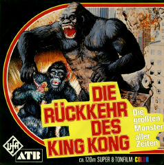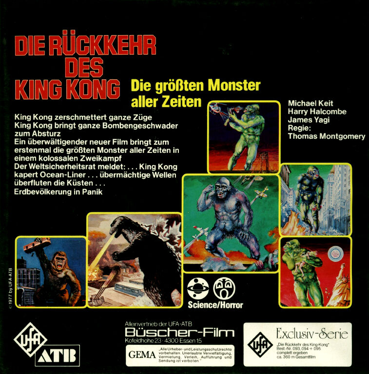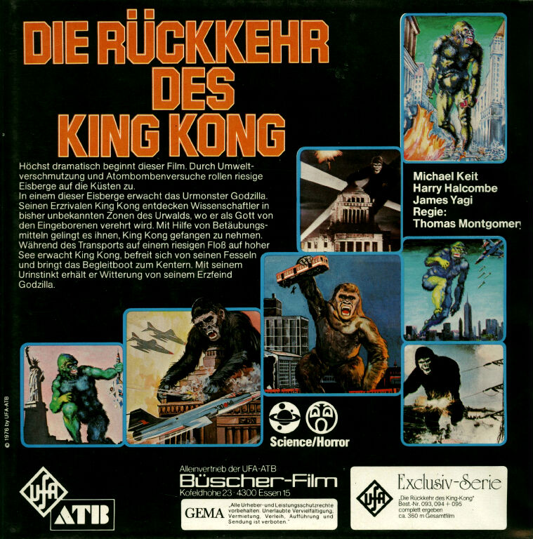 Zwei Jahre nach dem deutschen Kinostart veröffentlicht die UFA-ATB 1976 diesen sehr schön gemachten Dreiteiler. Umkopiert von CinemaScope auf Vollbild, wobei auch hier wieder nur bestimmte Teile des Bildes gezeigt werden und somit viel seitlich verloren geht. Die Bildschärfe schwankt zwischen gut und befriedigend. Der Schnitt ist sehr gut angelegt, wir sehen übrigens ein Fragment der deutschen Betitelung. Die Farben sind bei allen drei Akten unterschiedlich. Während Akt eins bereits etwas rotstichig ist, hat Akt zwei bessere Farben und Akt 3 wiederum hat etwas verblasste Farben. Der Ton ist stets sehr laut aufgespielt. Kurios ist das Cover des ersten Teils: Dort befindet sich kein UFA-ATB Logo links, wie auf den Covern von Teil 2 und 3, obwohl es auch Cover mit dem UFA-ATB Logo gegeben hat. Fazit: Für Godzilla Fans ein muss, da es der einzige Dreiteiler der Toho auf Super 8 ist, denn die vielen anderen Filme gab es nur als Zweiteiler oder in kürzeren Fassungen.