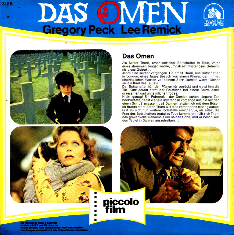 Klassiker des Horror-Genres, über den man nicht mehr viele Worte zu machen braucht, außer dass es sich immer wieder lohnt, ihn zu sehen! Für viele Fans ist "Das Omen" der beste Horrorfilm aller Zeiten, vielleicht, weil er das Böse nicht nur zeigt, sondern sich auch mit seinen Wurzeln befasst. Ein stofflich einfältiger, aber mit Sinn für szenische Spannung und Schocktechnik inszenierter Horrorfilm. (Filmkritik).