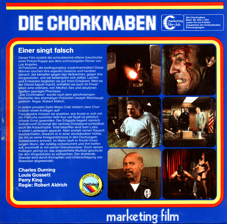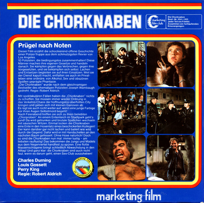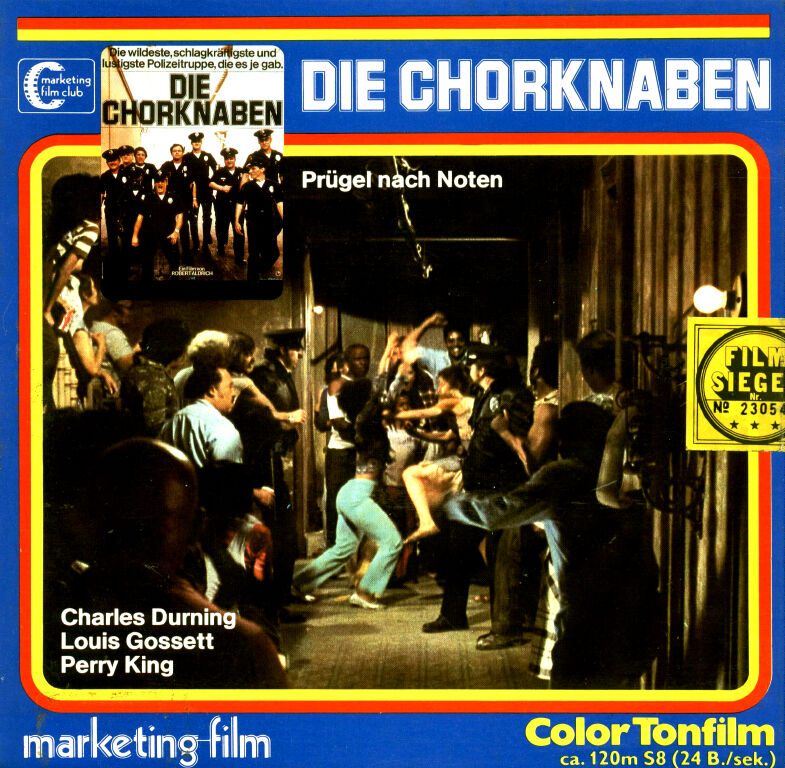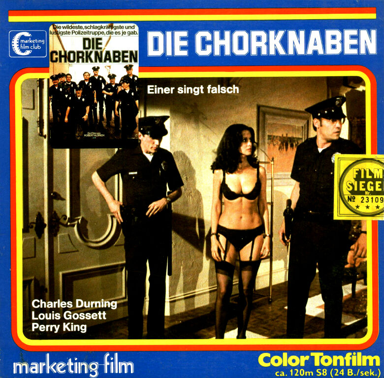 Erstaunlich das marketing-film hier nur einen Zweiteiler vorlegt, aber ich denke mal, als Dreiteiler hätte er sich schlecht verkauft. Zudem sind in dieser Schnittfassung die ausschließlich guten Szenen enthalten, denn das Original geht 120 Minuten. Nach dem alten marketing-film Logo folgt nur der Original Filmtitel - auf Nennung der Darsteller wurde verzichtet. Dann gehts gleich zur Sache. Beide Filme wurden auf Azetat, später auch auf Polyester nachkopiert. Die Polyester Kopie hat natürlich bessere Farben. Die Bildschärfe ist überwiegend gut, der Ton leider etwas leise aufgespielt. Beide Teile lassen sich gut zusammenschneiden. Obwohl ich den Film vom Kino her kenne, kann ich der Super 8 Fassung nichts abgewinnen. Lediglich die Szene mit dem schwulen Spaziergänger und den am Baum angeketteten nackten Polizisten lößten auch mir wieder Lachsalven aus (und dem Publikum natürlich auch!).