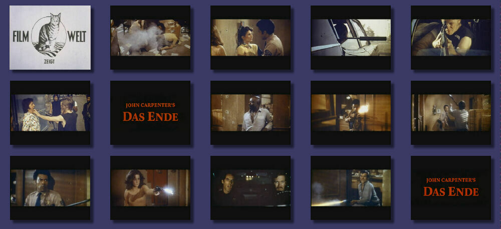 Der deutsche Umkehrtrailer zu John Carpenter`s Thriller DAS ENDE (Titel der Wiederaufführung). Er hat eine Länge von 1 Minute und 40 Sekunden. Kopiert wurde mit Balken. Die Bildschärfe ist befriedigend, Bildstand und Farben sind mit gut zu bewerten. Der deutsche Ton wurde klar und sauber aufgespielt. Hauptsächlich sehen wir hier Schusswechsel-Szenen vom Überfall auf das Polizeirevier, ein Sprecher aus dem Off kommentiert dazu. Musikalisch wurde der Trailer mit dem typischen Carpenter Soundtrack unterlegt, welcher den Spannungsbogen hochtreibt. Dieser Trailer wurde nur in Kleinstauflage veröffentlicht und ist definitiv eine Bereicherung für jede Sammlung. Die englische Firma Derann veröffentlichte eine 180 Meter Kurzfassung zu diesem Titel. [Ha.Ka.]
