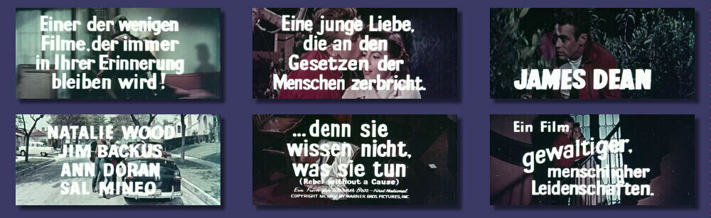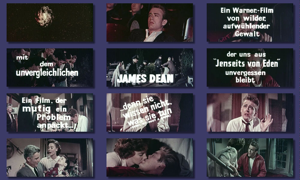 Der sehr schöne und gut erzählte Trailer dieses Kultfilms bietet viele Schrifteinblendungen in schönen Farben, guter Bildschärfe und laut aufgespielten Ton. Das CinemaScope Bild wird voll ausgeschöpft und zieht den Betrachter sofort in seinen Bann. Immer wieder schön ist die deutsche Synchronstimme von James Dean: "Dietmar Schönherr". Länge: 2 Minuten und 15 Sekunden. Wer den UFA Dreiteiler hat, sollte sich den Trailer unbedingt zulegen!