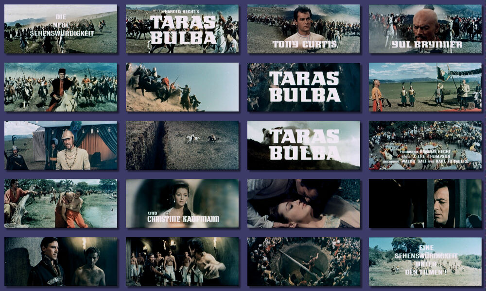 Wer Filme mit eindrucksvollen Massenszenen mag, sollte sich den Trailer zu diesem Leinwandabenteuer unbedingt zulegen. Yul Brynner in der Rolle des Kosakenführers "Taras Bulba" ist einfach herrlich anzusehen. Der deutschprachige Trailer besticht durch das breite CinemaScope Bild, das voll ausgeschöpft wird. Viele Titeleinblendungen runden diesen sehr schönen Trailer ab. Schöne Farben, gute Bildschärfe und ein klarer Ton sind weitere Vorzüge. Und die junge Christine Kaufmann - Sehenswert! Länge: 3 Minuten und 13 Sekunden.