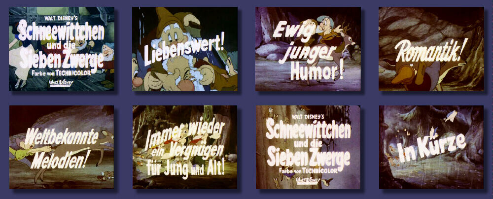 Das ist der 52 Sekunden Teaser-Trailer der Wiederaufführung 1963 durch den Walt Disney Filmverleih. Die Farben sind Traumhaft, die Bildschärfe ist sehr gut und der Ton laut aufgespielt. Sehr viele Schrifteinblendungen. Wunderschön!